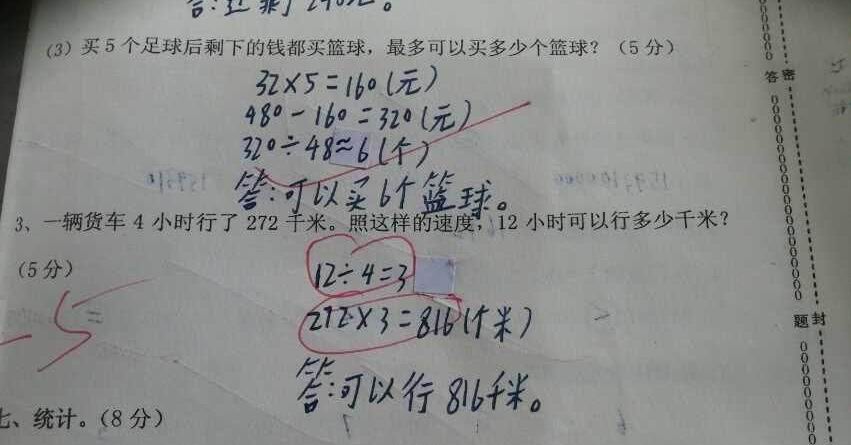 QUOTE(中国风格 @ 2014年01月26日 Sunday, 11:32 AM) 这么简单都不会啊!应该是:路程/时间=速度,那么272/4=68(千米/时),再速度*时间=路程,即68*12=816(千米),这就是标准答案。如果照你那样写,”12/4=3“代表什么意思?”272*3=816“代表什么意思?我看这答案是蒙的,不理解题目意思。 [snapback]3613185[/snapback] 如果你是教师,那你教出的只有定向思维的学生。图中学生解答是完全正确的,此学生懂得利用倍数原理解答应用题,思维能力比较强。12/4=3表示12小时是4小时的3 倍,272*3=816表示4小时所走路程的3倍是多少,那么这个路程刚好是12小时走的路程。用这种方法计算起来还会比较简便一些,我想信该学生也懂得你所说的方法,但他有多种想法,所以选择了计算简便的倍数原理解答。综上所述,此题是改卷教师误改题,学生应该得5分,且此学生有培养成为数学尖子的潜质。