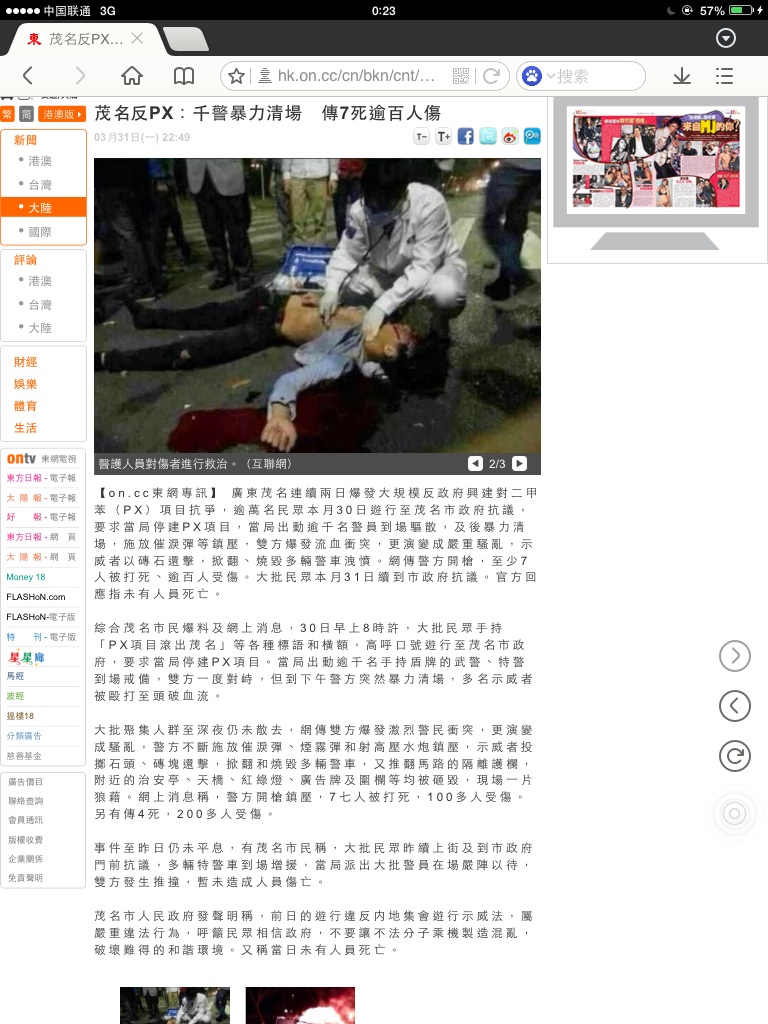 hchcc 荣誉会员 荣誉会员 注册 2004-08-21 消息 7,438 反馈评分 1,832 点数 191 性别 男 2014-04-01 #497 茂名反PX:千警暴力清觥7死逾百人 http://hk.on.cc/cn/bkn/cnt/news/20140331/b..._05011_001.html
