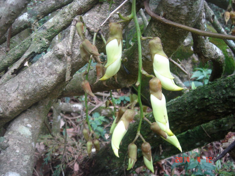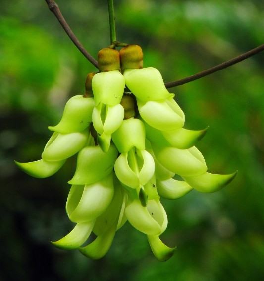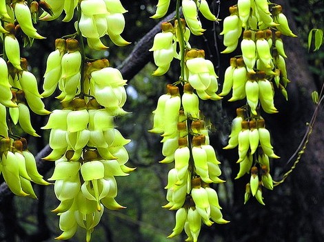 禾雀花,学名白花油麻藤,属蝶形花科,是中国国家二类保护植物。禾雀花外形奇特,花开四(五)瓣,花托似禾雀头,两旁各有一粒似眼睛的小黑点,正中的一瓣,弯弓似雀背,两侧的花瓣似雀翼,底瓣后伸,是为尾巴,花内有一撮细长略弯的花蕊,人们称之为“禾雀内脏”。禾雀花初开时为翡翠绿色,盛开时为柠檬黄色,非常漂亮。它又有着各种惟妙惟肖的动作造型,且“受伤”时还会“流血”,可谓植物界的奇珍异品。禾雀花开在长长的藤蔓上,吊挂成串,每串二十至三十朵不等,串串下垂,游人远远望去,似是百鸟栖枝,雀跃花香,令人叹为观止。