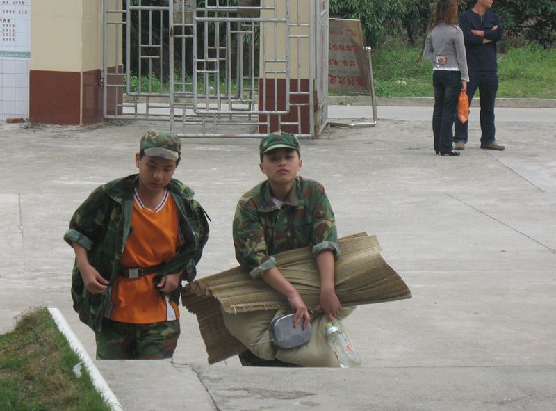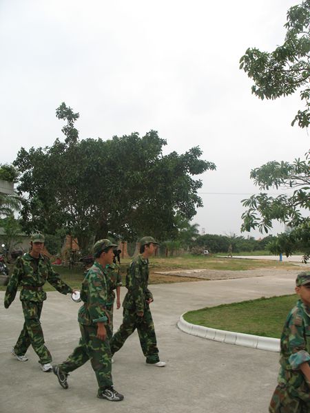 第一天开幕后,就有十几个同学围着我就说要回去。老师看到你们的辛苦了,头发已经湿透贴在额头上,脸晒得红红的,汗水也在直流,衫也湿到了衫尾,知道你们还从没受过这种苦。我说,想想爹爹妈妈现在也在海上打鱼、在农田上耕种容易吗?想想我们解放军叔叔为保卫国家日夜训练,与他们的辛苦相比,你们这点苦算得了什么?你们还真懂事,低头不语,又高高兴兴投入训练。