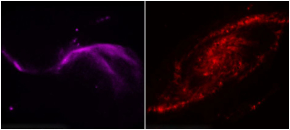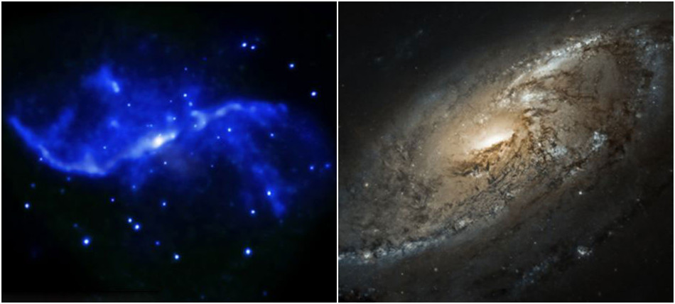 美国宇航局的数据显示NGC 4258星系中央的巨大黑洞正在源源不断地释放出高能粒子喷射流研究人员认为,是这些高能粒子流撞击星系盘,从而产生产生了冲击波。这些冲击波对周围气体(主要是氢气粒子)进行加热,温度高达几千摄氏度。美国宇航局还公布了“烟火秀”的其他照片,美国宇航局“钱德拉X射线”观测台拍到的“烟火”照片是蓝色的,而斯皮策太空望远镜检测的“烟火”则是红色的。此次“烟火秀”距离地球2300万光年