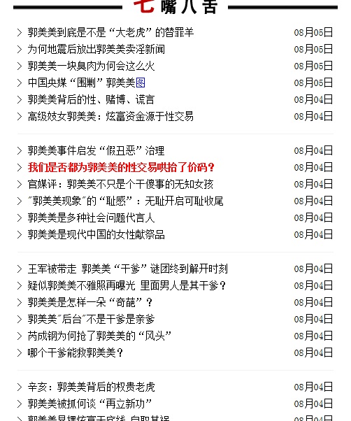 二,中央电视台对薛蛮子嫖娼、东莞扫黄等事件的报道不遗余力,大肆渲染,但短短几个月的时间里,自己的数位领导、编辑和主持人被有关部门带走,却只字不提,郭振玺、芮成刚等,不是都可以做专题报道吗?当自己的道德被质疑、信用被消减时,推出郭美美的专题报道,舆论的调侃、反问、责难等等,都不奇怪。特别是报道中涉及郭美美被包养、卖淫等情节,反而激起了舆论对中央电视台几个「失联」美女主持人的猜测与演绎。