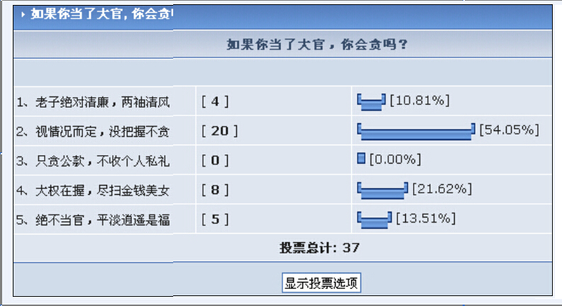 且不追问作者发起投票的初衷,仅从投票的37位网民的结果来说,其基本可以代表了当今社会的思潮DD“人为钱死,鸟为食亡”的真谛。从第二项与第四项的人数比例来说,其占了总人数的75.67%,也就是说,有75.67%的人敢于承认自己真实的内心世界,承认自己在可能的情况下,绝对不会像第一项的四个“傻瓜”那样两袖清风。这一调查不仅演示了人性的真实一面DD鬼性,同时也反映了虚拟的网络世界的某一作用DD宣泄自己的情绪与暴露真实的内心世界。鄙人并非赞赏人的鬼性DD“贪腐”,而是褒奖敢于承认自己真实的内心世界的社会公民,因为其比那些披着“羊皮的狼”DD“台上反腐,台下贪腐”,心口不一的口头革命派更加真实。纵观历史上与当下被推上审判台上的多数贪官污吏,其可曾承认自己存在贪腐的私念?哪个不是道貌岸然的正人君子?哪个不是清正廉明的父母官?谁知道台上满口仁义道德的家伙背后的男盗女娼的龌龊?因此,鄙人肯定这75.67%的同胞朴素的人文素养,当然并非苟同其“大权在握,尽扫金钱美女”的龌龊灵魂。从这个75.67%的数字来说,此更能彰显领袖的作用了!鄙人曾经讲过:“一个政府到底应该如何产生?这倒不是问题的关键,而是政府首脑人物应该具备的素质以及肩负的义务。鄙人认为,政府的责任应该是服务、管理和指导。如果一个政府没有了为人民服务的宗旨,缺少为民办事的精神,那这个根本不可以称为政府,而是官僚。当然,政府之所以要成为政府,并非仅仅因为政府的服务功能,而是因为社会集团的行为需要,要不整个社会便是一盘散沙了。这是历史的经验总结,就算到了大同世界的共产主义也不能没有一个能够管理社会的组织首脑机构。政府存在的第三个原因在于社会人思维的复杂与人的认知水平的差异。如果没有一个能够凝聚众心,并对众心进行必要导示的首脑人物,那么这个社会将是众说纷纭,莫衷一是,根本没有办法选择这个社会应该继续维继的方向。”当然,从人的“鬼性”来说,没有人不贪心,贪心几乎可以说属于人生存的必要属性DD“物竞天择,适者生存”,要不其就不可能活下去。也就是人的这种“贪欲”,使得人类种族得以繁衍生息,香火不灭,并且推动着我们的社会从刀耕火种的原始状态走出,奔向更加繁荣昌盛的未来。从这点来说,人的这一属性不应该受到贬斥,其属于社会进步的动力因素。可是为了生存而存在的这种“贪欲”远远不同于“大权在握,尽扫金钱美女”的龌龊灵魂,也就是说,“贪欲”应该受到社会需要的制约,而非任由“贪欲”无度的膨胀,这就得依赖领袖的作用DD指导公民走向一个正确的方向,一个社会可以继续维继的方向。