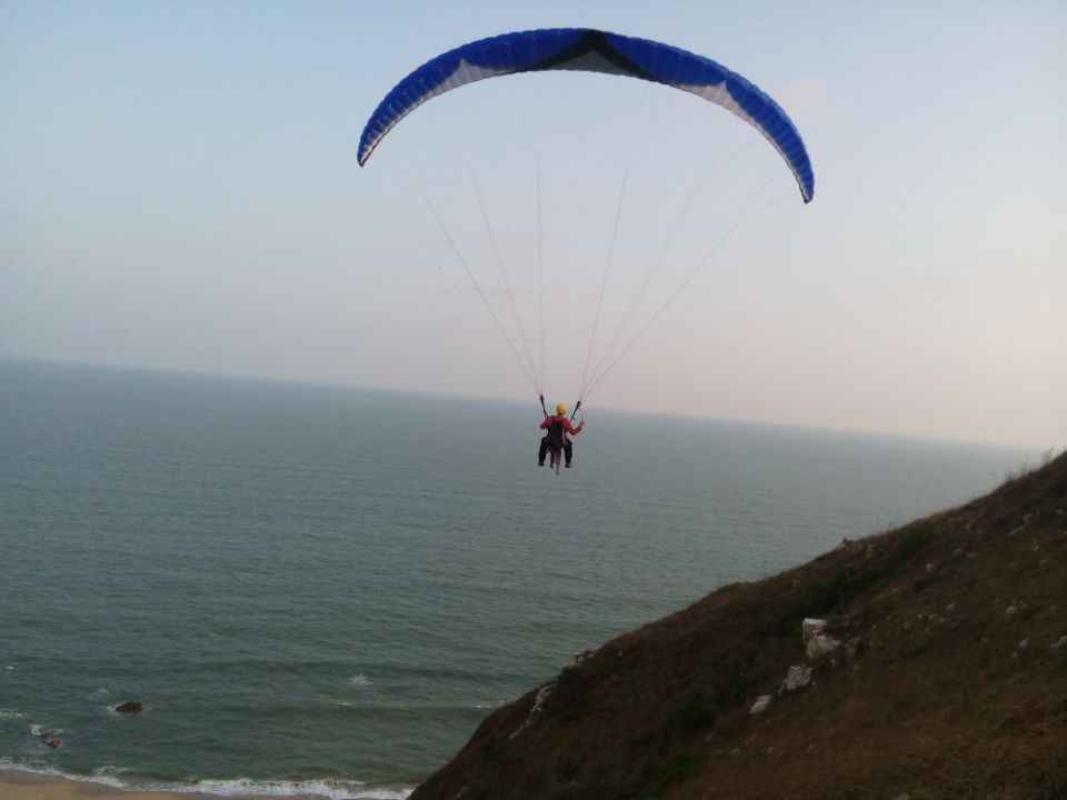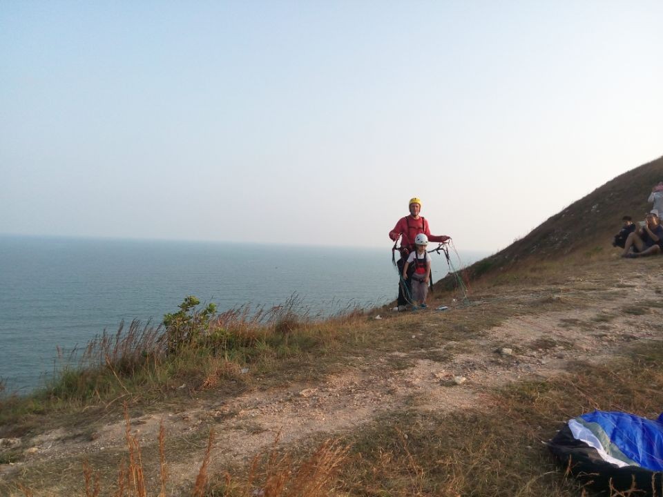 下午试了好久,他终于在助手的协助下,成功地带着孩子在山上海面上下来回飞翔,见者无不惊叹!