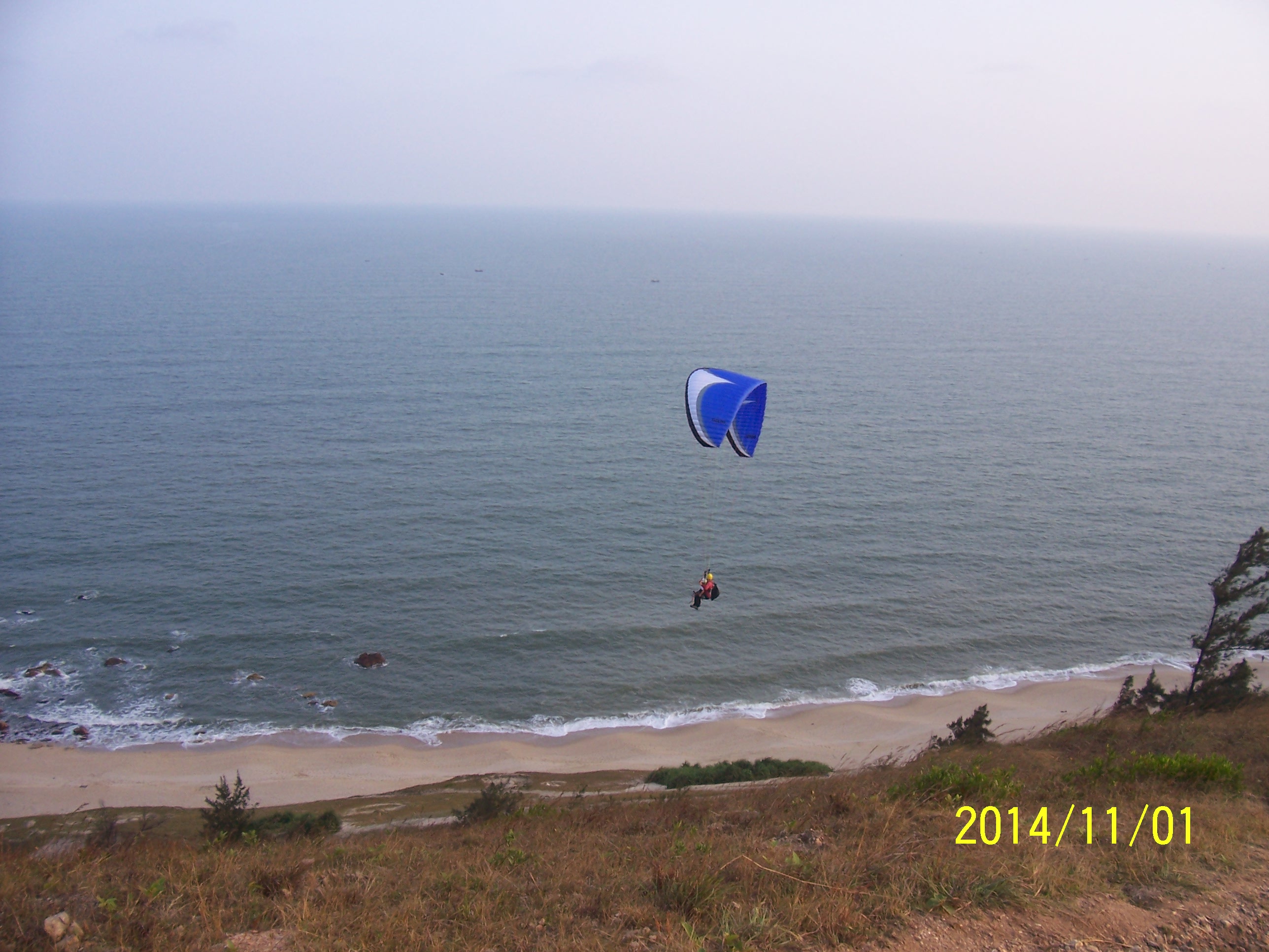 11月1日,闰九重阳,碧空如洗,海水蔚蓝,晏镜岭山上山下游人较多,有在洋人与孩子在滑翔。