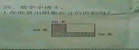 QUOTE(莫言 @ 2014年12月02日 Tuesday, 01:49 PM) 有想过你假设的X可以无限加长的吗?为什么算出来是60?我加长至1000米也可以的,并不会改变图中60、30、20这几个数据。 [snapback]3719421[/snapback] 你能按你的说法画出这样图吗?加长至1000米也可以.但就是另一个图形面积,和本题阴影面积不同了,想想吧