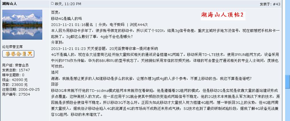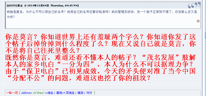 初悟人生 大学三年级 注册 2010-07-13 消息 858 反馈评分 0 点数 0 2014-12-06 #78 QUOTE(莫言 @ 2014年12月06日 Saturday, 02:27 AM) 莫言拿什么大奖还要和你一个草根说清楚?你发了十几个贴有没有和管理员说了? [snapback]3720430[/snapback] 煞有其事的样子俨然自己就是真正莫言了!而且还说“你一个草根!”这不是说这个盗世欺名的东西出身乃“万庆良”那样的达官贵人了?哈哈哈哈!!!!!!!!论坛有没有镶金牙的?小心破财了! [attachmentid=335462] 附件 莫言的海口夸大了!.jpg 513.6 KB · 查看: 271