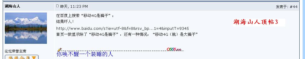 莫言 大学三年级 注册 2009-11-03 消息 875 反馈评分 3 点数 1 2014-12-09 #86 QUOTE(绵羊尖 @ 2014年12月08日 Monday, 11:48 PM) 论坛垃圾一个。 [snapback]3721081[/snapback] 其实我对你一直无视,你不爽!我明白的。
