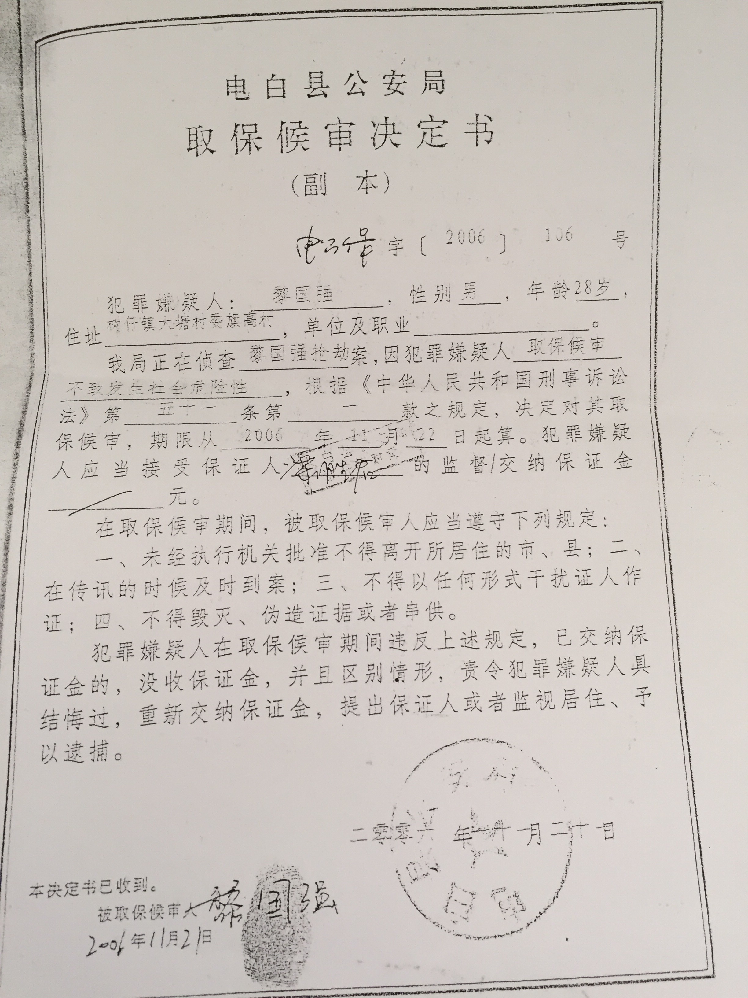 事实五:2006年10月16日,黎国强因抢劫案被电白县公安局刑拘。省人大代表梁文生为了帮黎国强办理取保候审和销毁“案底”、“漂白”其身份,在广州市天河区某小区买下一套商品房送给时任电白政法委书记兼公安局长张爱国。收到梁文生的商品房后,出差在张家界的张爱国立即指示时任公安局副局长崔球、刑警大队长张良给黎国强办理取保候审。因抢劫罪是暴力犯罪,对社会有危险性,且量刑可能在3年以上,不符合法律规定的取保条件,故崔球在黎国强的取保批复书上注明:张书记电话交待办理黎国强取保候审(黎国强取保候审的保证人是梁文生的父亲梁胜君)。正是这次取保候审才导致黎国强团伙更加嚣张,无恶不作,才导致2006年以后,一宗命案和数十宗恶性案件发生,黎国强黑社会团伙更加“壮大”,也更加疯狂的危害社会。这样的官匪同流合污也许就是电白治安恶化和枪支泛滥的源头。但这责任应由谁承担?为何纪委部门检察部门不介入调查追究?