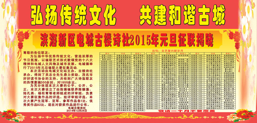 为弘扬中华优秀传统文化,营造浓厚的节日氛围,以楹联艺术形式歌颂党的十八大精神和电城人文风物及城市发展。电城镇举行了2015年元旦楹联大赛征集活动.