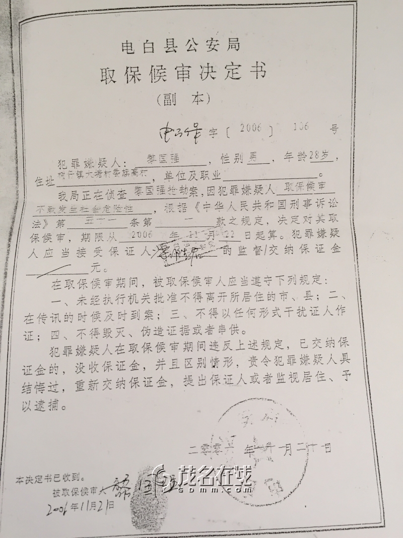 事实五:2006年10月16日,黎国强因抢劫案被电白县公安局刑拘。省人大代表梁文生为了帮黎国强办理取保候审和销毁“案底”、“漂白”其身份,在广州市天河区某小区买下一套商品房送给时任电白政法委书记兼公安局长张爱国。收到梁文生的商品房后,出差在张家界的张爱国立即指示时任公安局副局长崔球、刑警大队长张良给黎国强办理取保候审。因抢劫罪是暴力犯罪,对社会有危险性,且量刑可能在3年以上,不符合法律规定的取保条件,故崔球在黎国强的取保批复书上注明:张书记电话交待办理黎国强取保候审(黎国强取保候审的保证人是梁文生的父亲梁胜君)。正是这次取保候审才导致黎国强团伙更加嚣张,无恶不作,才导致2006年以后,一宗命案和数十宗恶性案件发生,黎国强黑社会团伙更加“壮大”,也更加疯狂的危害社会。这样的官匪同流合污也许就是电白治安恶化和枪支泛滥的源头。但这责任应由谁承担?为何纪委部门检察部门不介入调查追究?