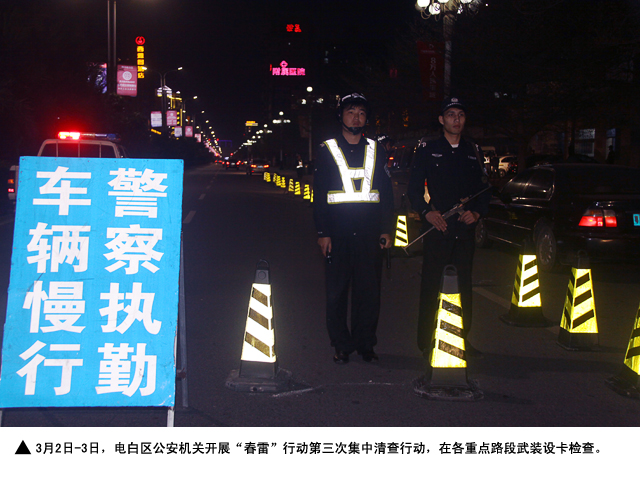 为深化社会治安重点整治行动,持续保持严打高压态势,确保全国“两会”及我区“年例”期间社会治安大局稳定,3月2日至3日,电白公安机关开展严打整治“春雷”行动第三次集中清查行动。