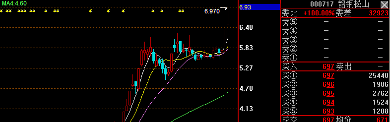 2015年4月09日买了两股, 短线000656,中线钢铁股000717。 短线的只有升5%左右,(赚得少不好意思公开)中线000717已超过20%(3天小赚5万元人民币)明天走人了。 富安娜002327 搜于特002503这个两股不一定能升,属个人爱好,不喜勿喷。