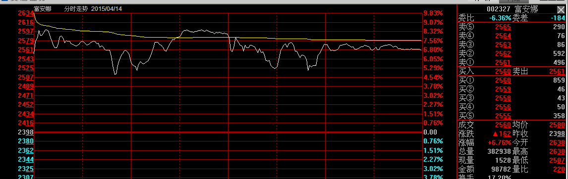 QUOTE(司空苍雪 @ 2015年04月13日 Monday, 09:20 PM) 2015年4月09日买了两股, 短线000656,中线钢铁股000717。 短线的只有升5%左右,(赚得少不好意思公开)中线000717已超过20%(3天小赚5万元人民币)明天走人了。 富安娜002327 搜于特002503这个两股不一定能升,属个人爱好,不喜勿喷。 [snapback]3744086[/snapback] 昨天买了今天小升5%和6%