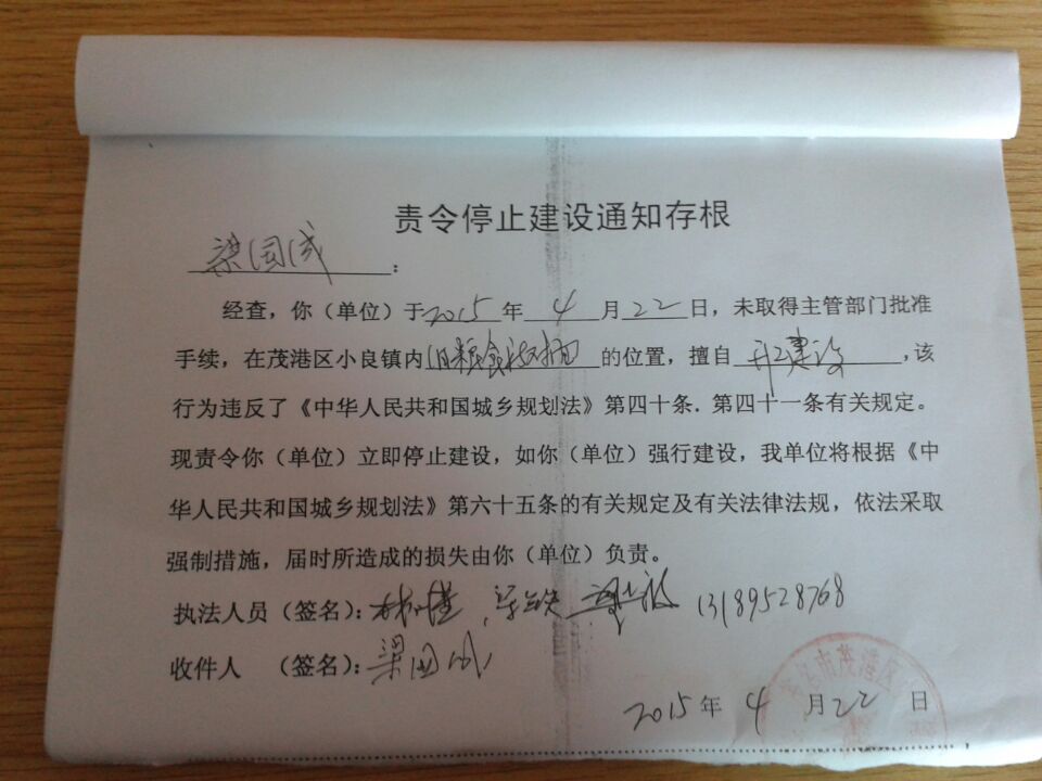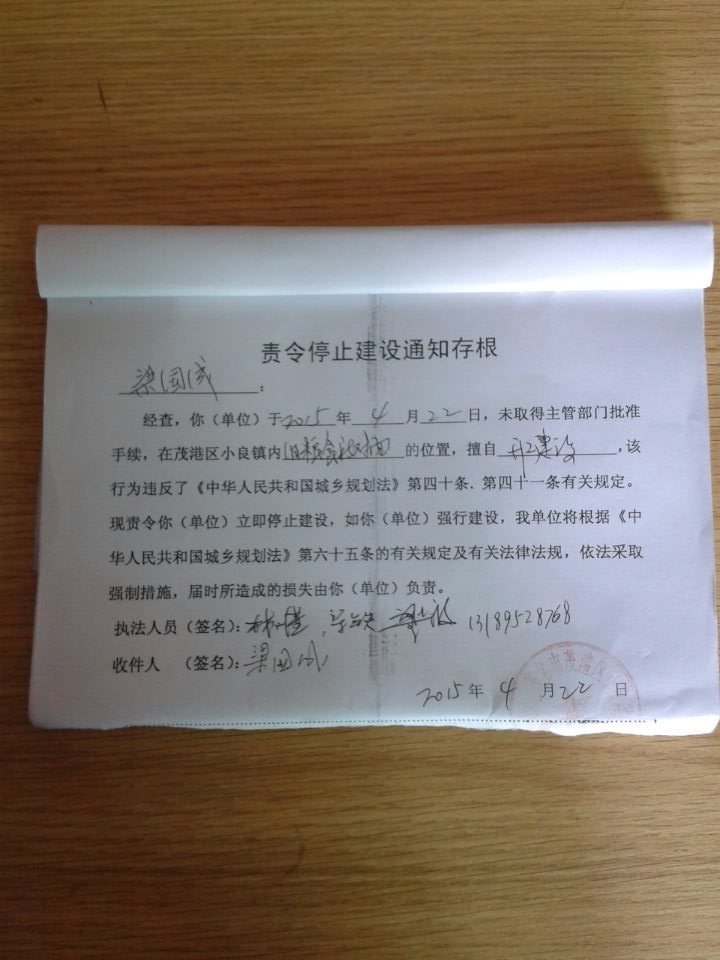 贴中所称梁国成与执法部门尖锐对峙一事,4月22日小良镇国土所、村建办执法人员到现场处置,并下达了停建通知书,梁国成已签字确认,停止违建。