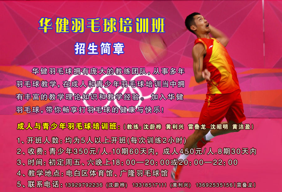 H hlxgddb 学前班 注册 2007-07-09 消息 35 反馈评分 0 点数 0 2015-06-29 #1 电白华健羽毛球培训班开始啦! 开设有青少年班和成人班以及暑期班和长期班。 学打羽毛球从华健羽毛球开始! 电白华健羽毛球与您一起快乐健康成长! 附件 2015-06-25 20.05.10.jpg 70.2 KB · 查看: 151 华健培训宣传单张70张.jpg 196.4 KB · 查看: 240