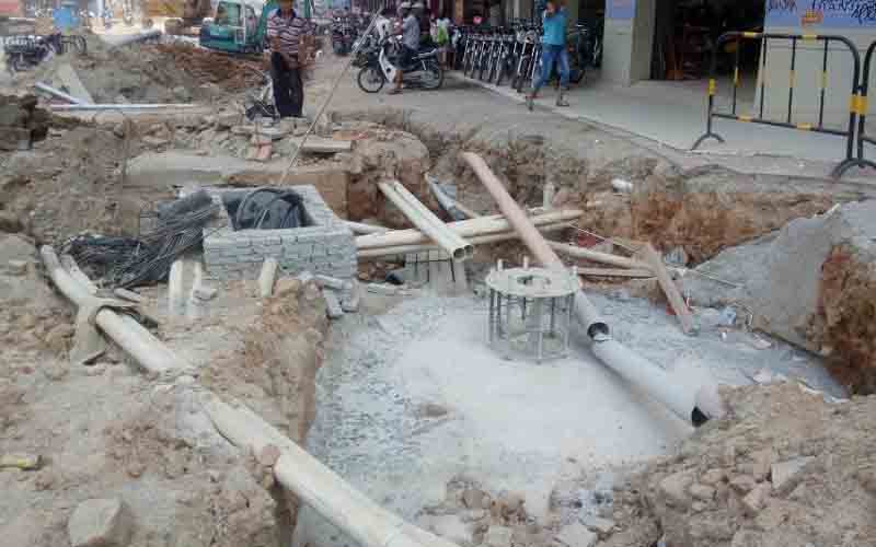 在水东加油站至中心台段,施工人员正在紧张施工,道路上还是熟悉的各种挖掘机,搅拌机等大型器械,现场可以看到,有少数路段还在进行管道铺设。