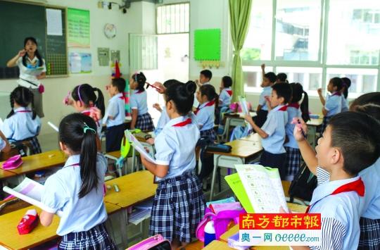 9月21日,广州47中汇景实验学校二年(4)班,学生们在语文课上用20分钟专门练习写字,对着字帖念口诀。南都记者 冯宙锋 摄