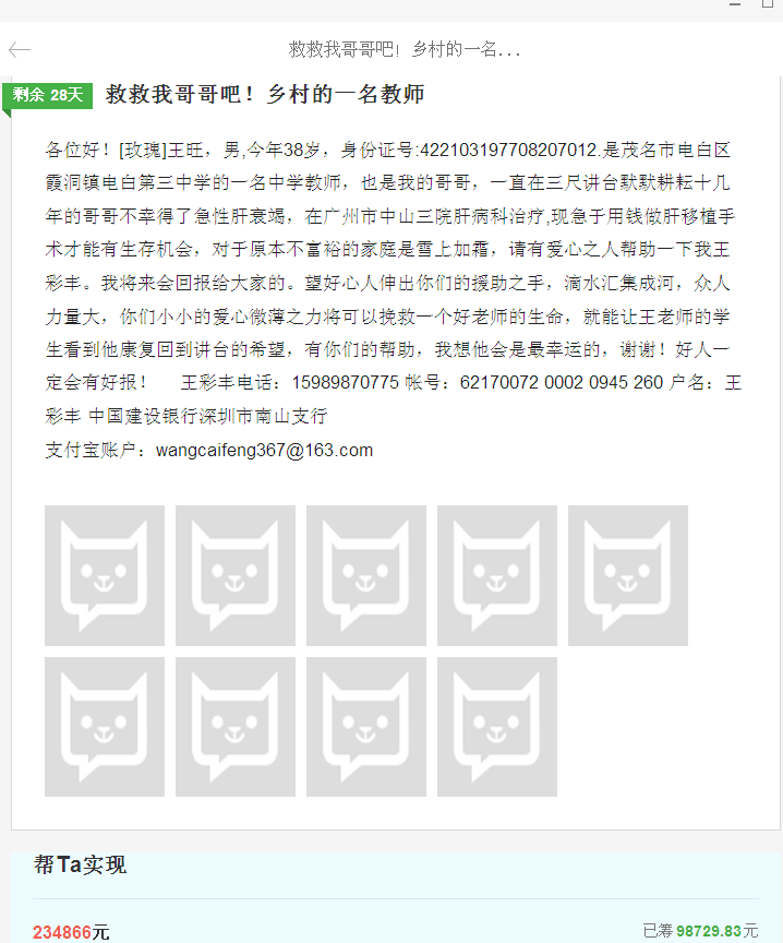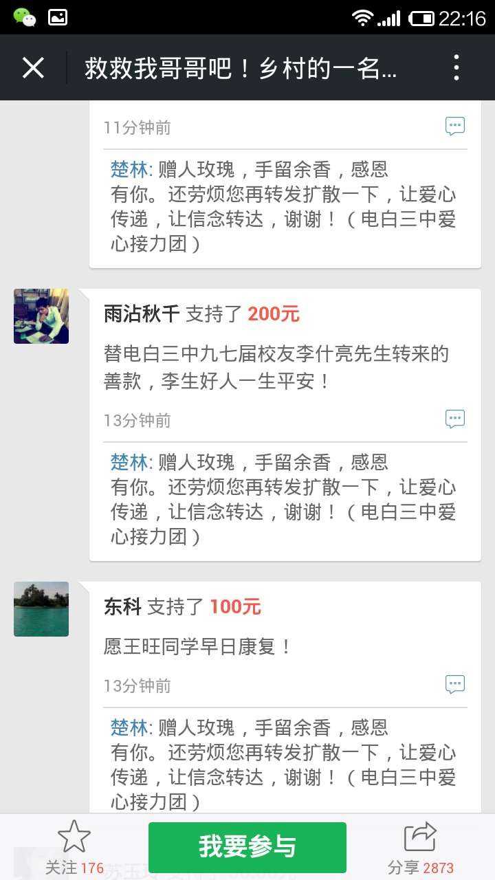一 一点云 小学三年级 注册 2006-10-21 消息 222 反馈评分 5 点数 1 2015-10-25 #95 大家提防骗子。捐款帐号和众筹平台的不会变。非常感谢你的支持和帮助!赠人玫瑰,手留余香,感恩有你。(电白三中爱心接力团)