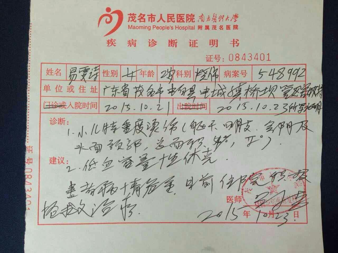 一位退伍兵的求助!我的战友2015.10.21中午,广州军区42集团军,防化团九连退伍战士易振华的女儿在邻居家玩时,拽倒了刚煮好的一大锅鸡汤,滚烫的鸡汤瞬间从小孩的头淋到脚,全身严重烫伤!目前小孩在茂名人民医院1号楼20层29床重症室,十天内是危险期,现每天医疗费用需要几千元,振华战友本人因眼睛问题,影响了工作,现家境困难,请大家伸出援手,祈福也好,捐款也好,帮助易振华渡过这个难关!大捐小捐都是一份爱心,微信转账,发红包,汇款,都可以!