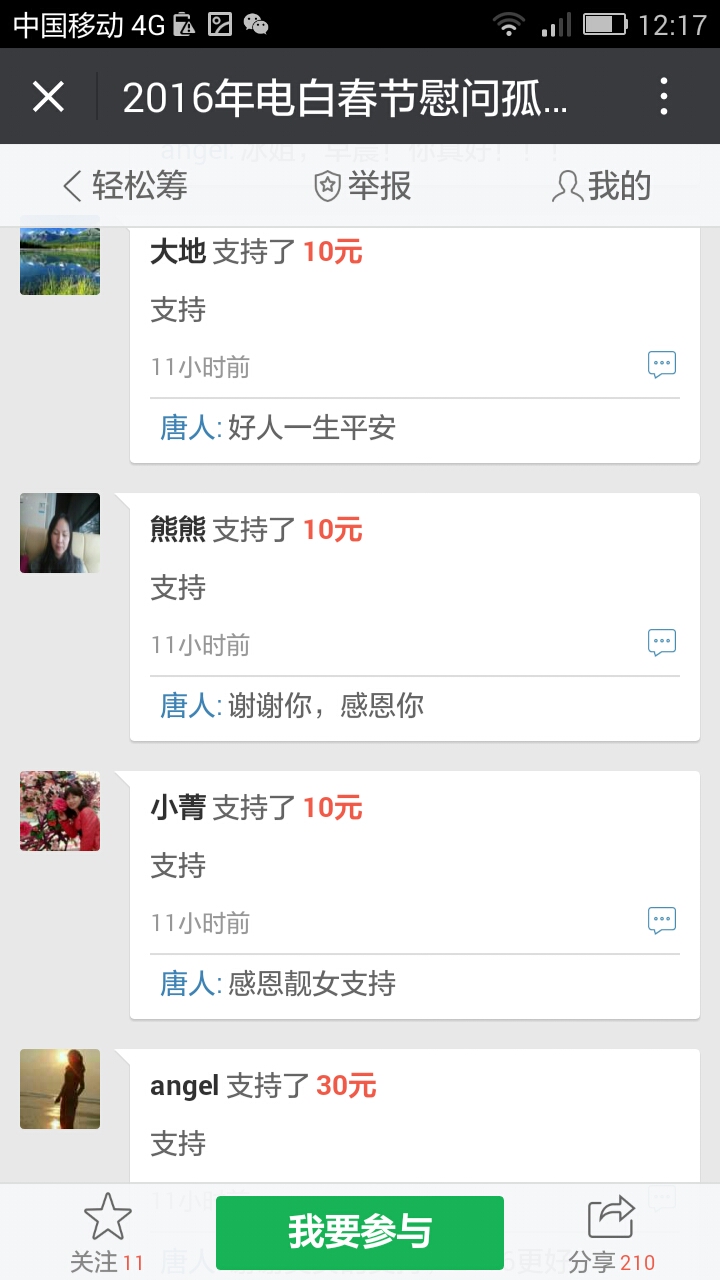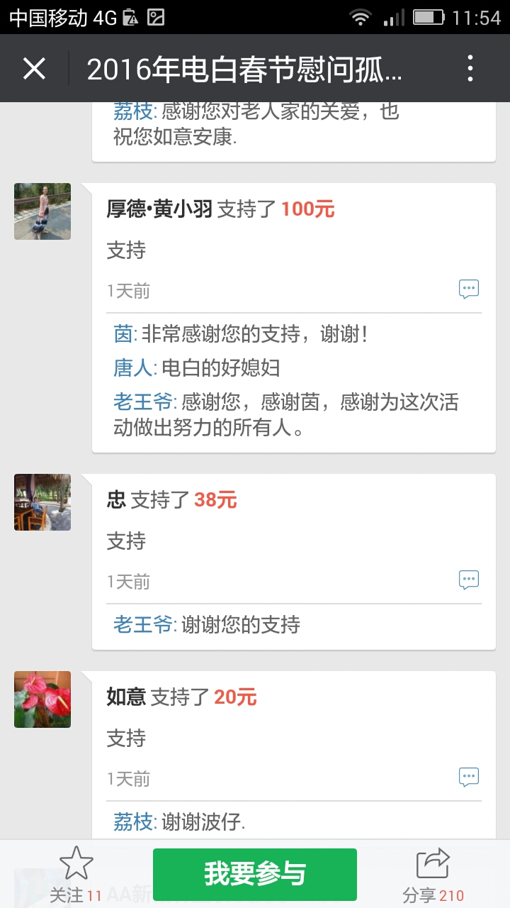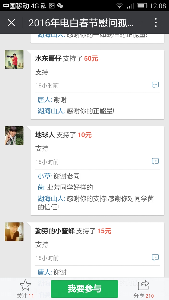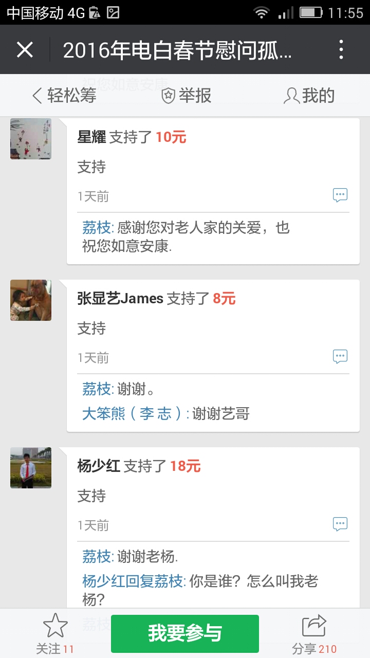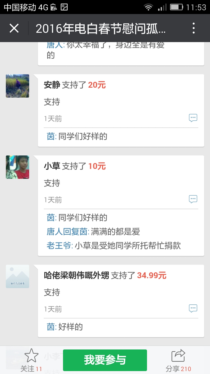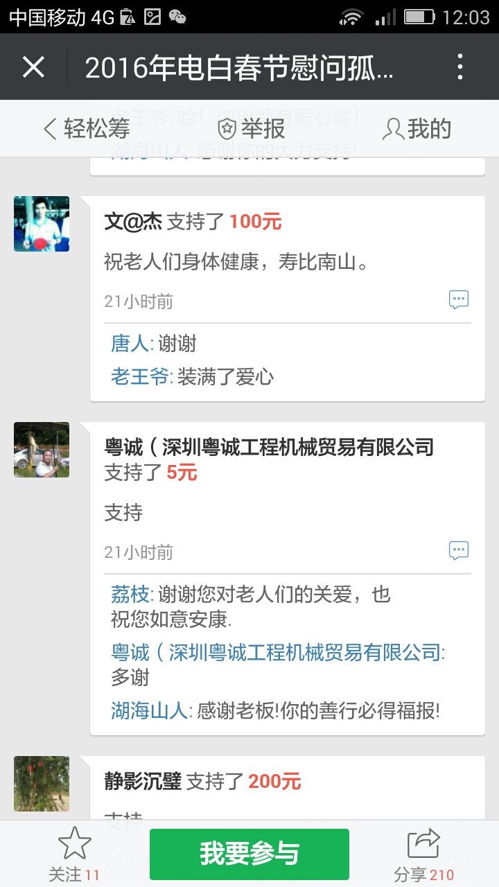 更新下我本人收到的义款: 广州卖手机大哥:209.90元; 飘落的黄叶 88.88元; 陈先生 200;元 等待真爱 200元; 赤子之心 99.99元; 黄先生 300元; 黄锦东 50元; 竹子3元 涯糸观珠人100元 上德坛友200元 上德坛友68元 杨梓昕500元 黄雪媚200元 以杨梓昕为名的义款是我们收到的第二个500元(第一个.第三个分别是轻松筹上黄瑞炎先生和太阳花赞助的)――也是本次开展活动以来所收到的最大额的义款.