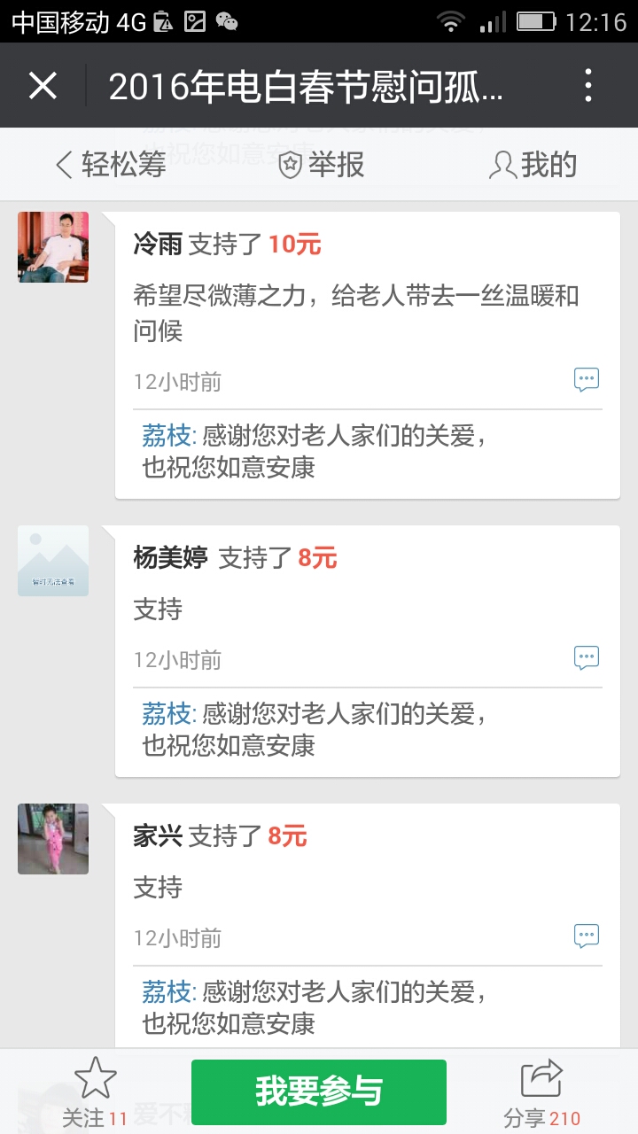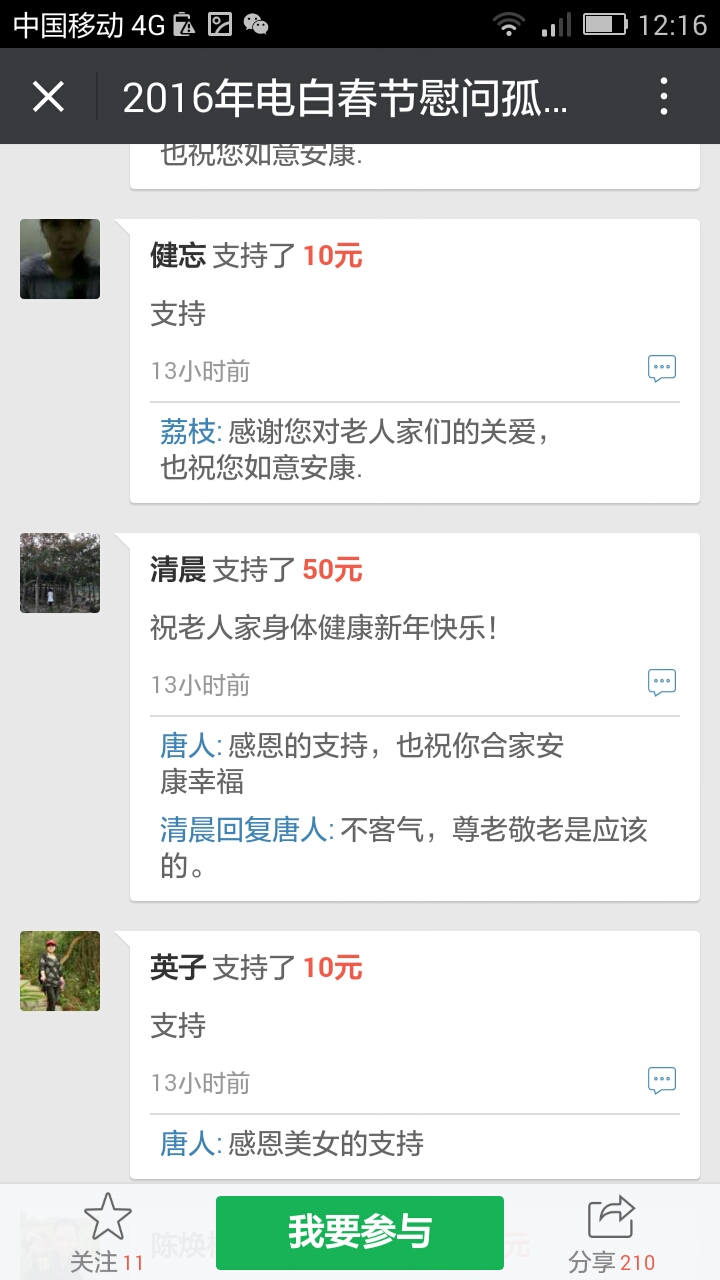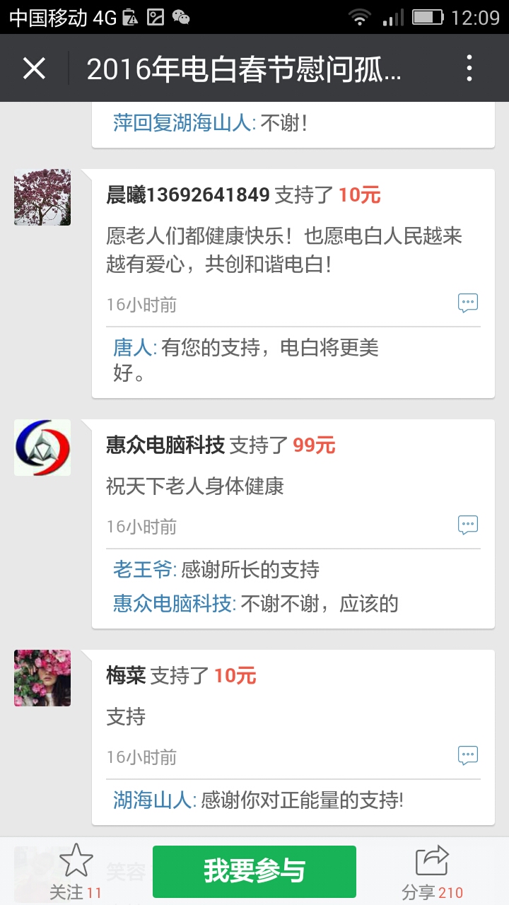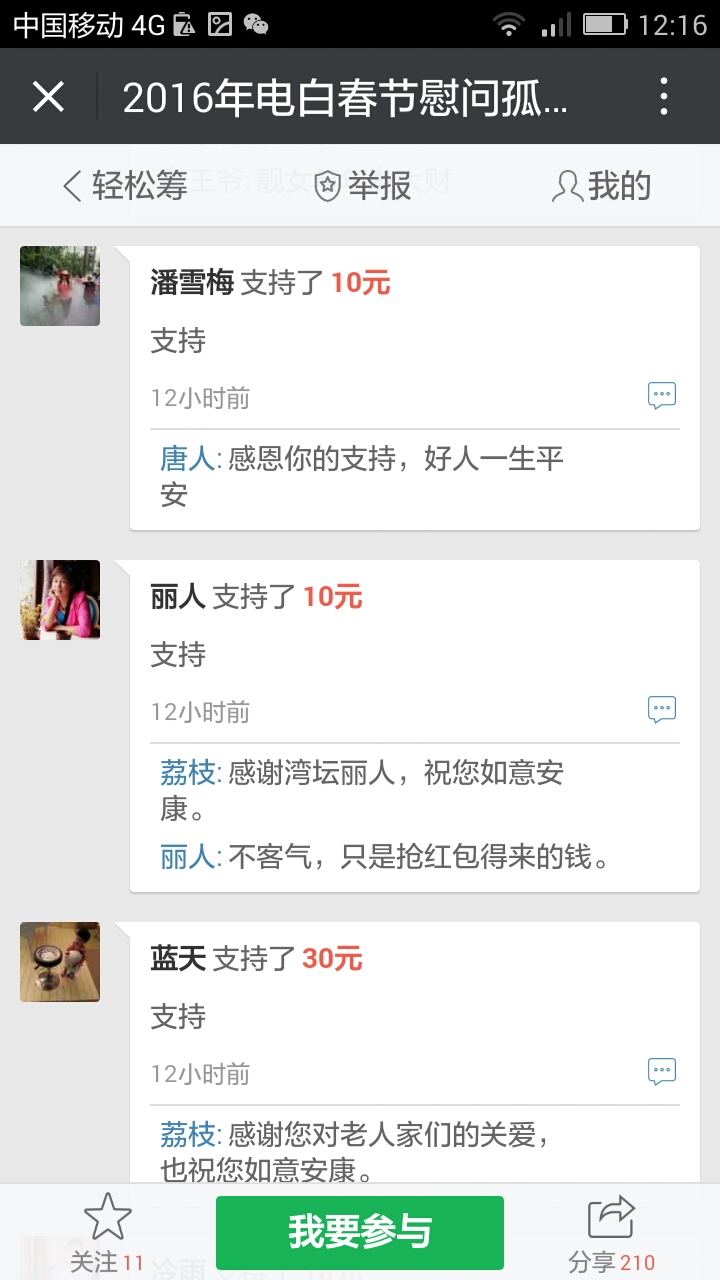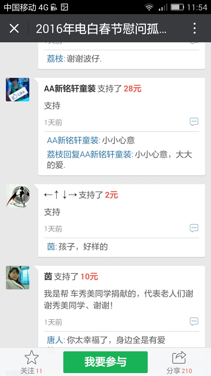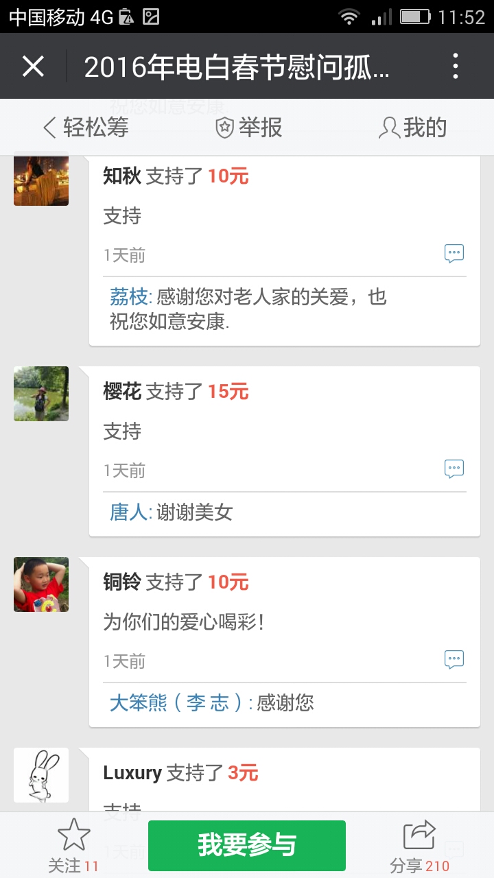 更新下我本人收到的义款: 广州卖手机大哥:209.90元; 飘落的黄叶 88.88元; 陈先生 200;元 等待真爱 200元; 赤子之心 99.99元; 黄先生 300元; 黄锦东 50元; 竹子3元 涯糸观珠人100元 上德坛友200元 上德坛友68元 杨梓昕500元 黄雪媚200元 以杨梓昕为名的义款是我们收到的第二个500元(第一个.第三个分别是轻松筹上黄瑞炎先生和太阳花赞助的)――也是本次开展活动以来所收到的最大额的义款.