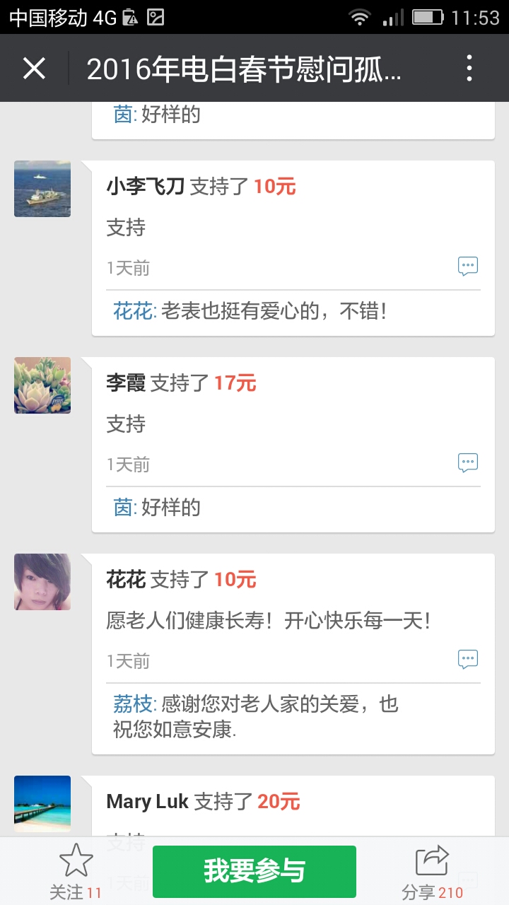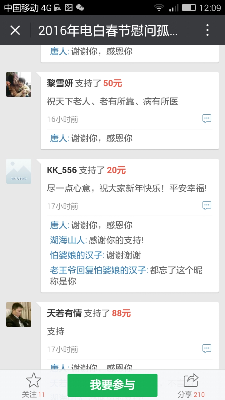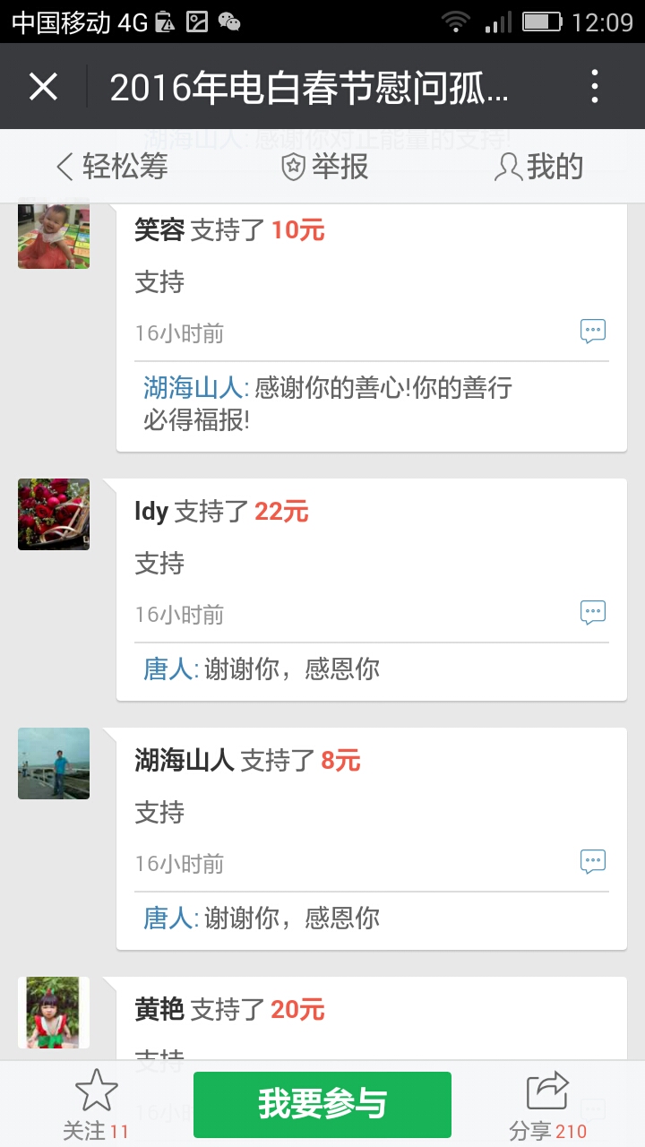 更新下我本人收到的义款: 广州卖手机大哥:209.90元; 飘落的黄叶 88.88元; 陈先生 200;元 等待真爱 200元; 赤子之心 99.99元; 黄先生 300元; 黄锦东 50元; 竹子3元 涯糸观珠人100元 上德坛友200元 上德坛友68元 杨梓昕500 以杨梓昕为名的义款是我们收到的第二个500元(第一个是轻松筹上黄瑞炎先生赞助的)――也是本次开展活动以来所收到的最大额的义款.
