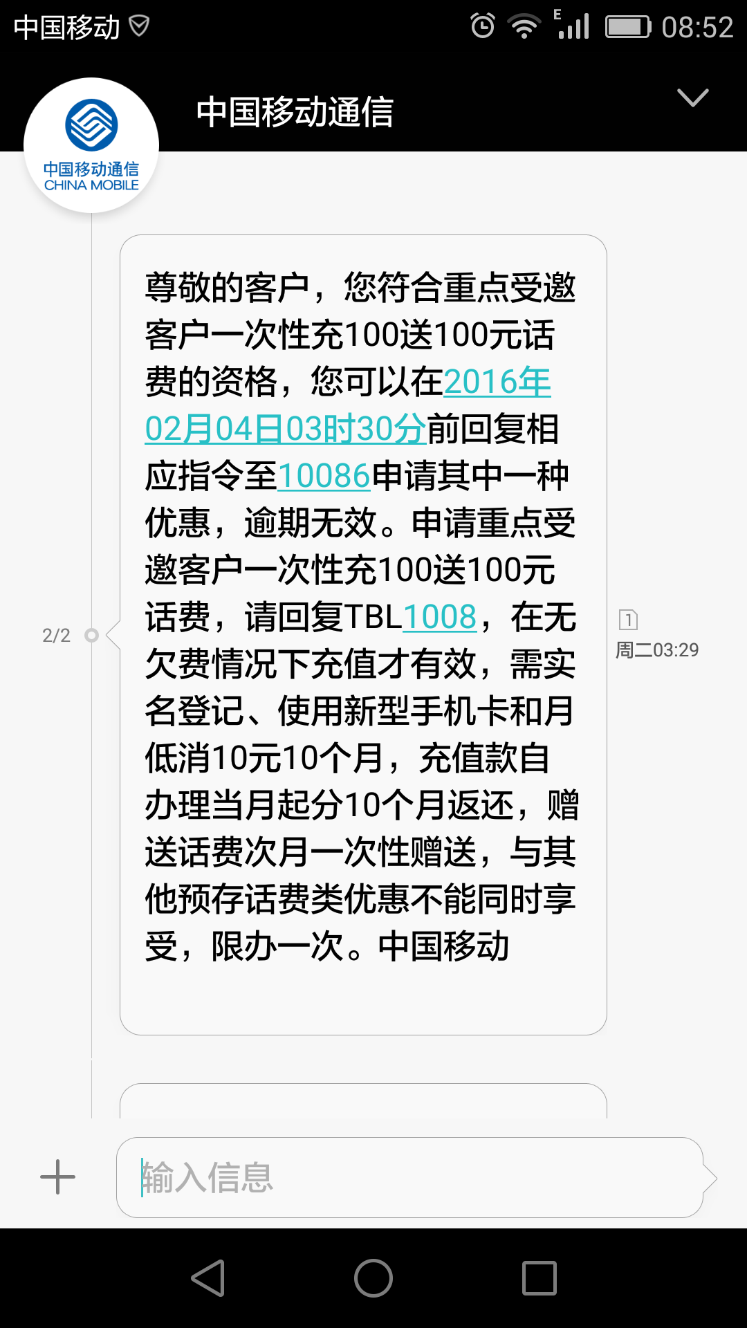“尊敬的客户,您符合重点受邀客户一次性充100送100元话费的资格,您可以在2016年02月04日03时30分前回复相应指令至10086申请其中一种优惠,逾期无效。……中国移动”