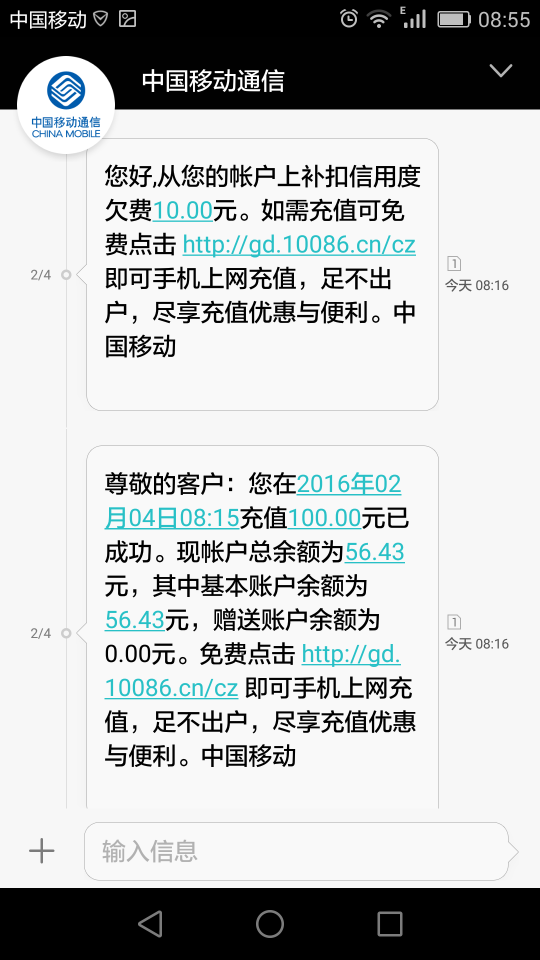 我是一月中下旬买的手机,按道理那600块话费应在二月份到账,但它迟迟没有动静,每次打电话都听到“你的话费不足十元……”的八婆声,于是,我便充了一百大洋!充值后,中国移动给我发来如下信息: