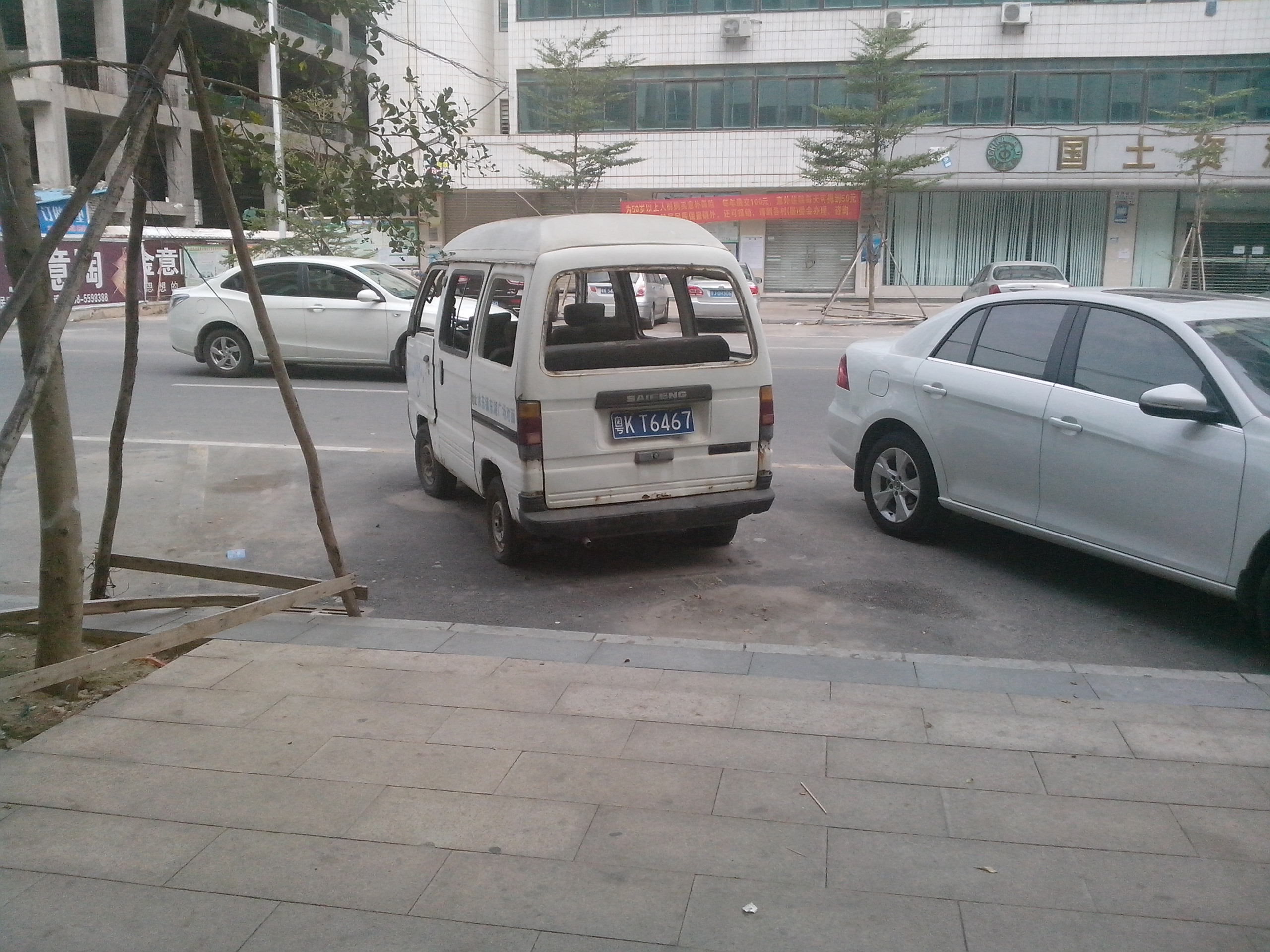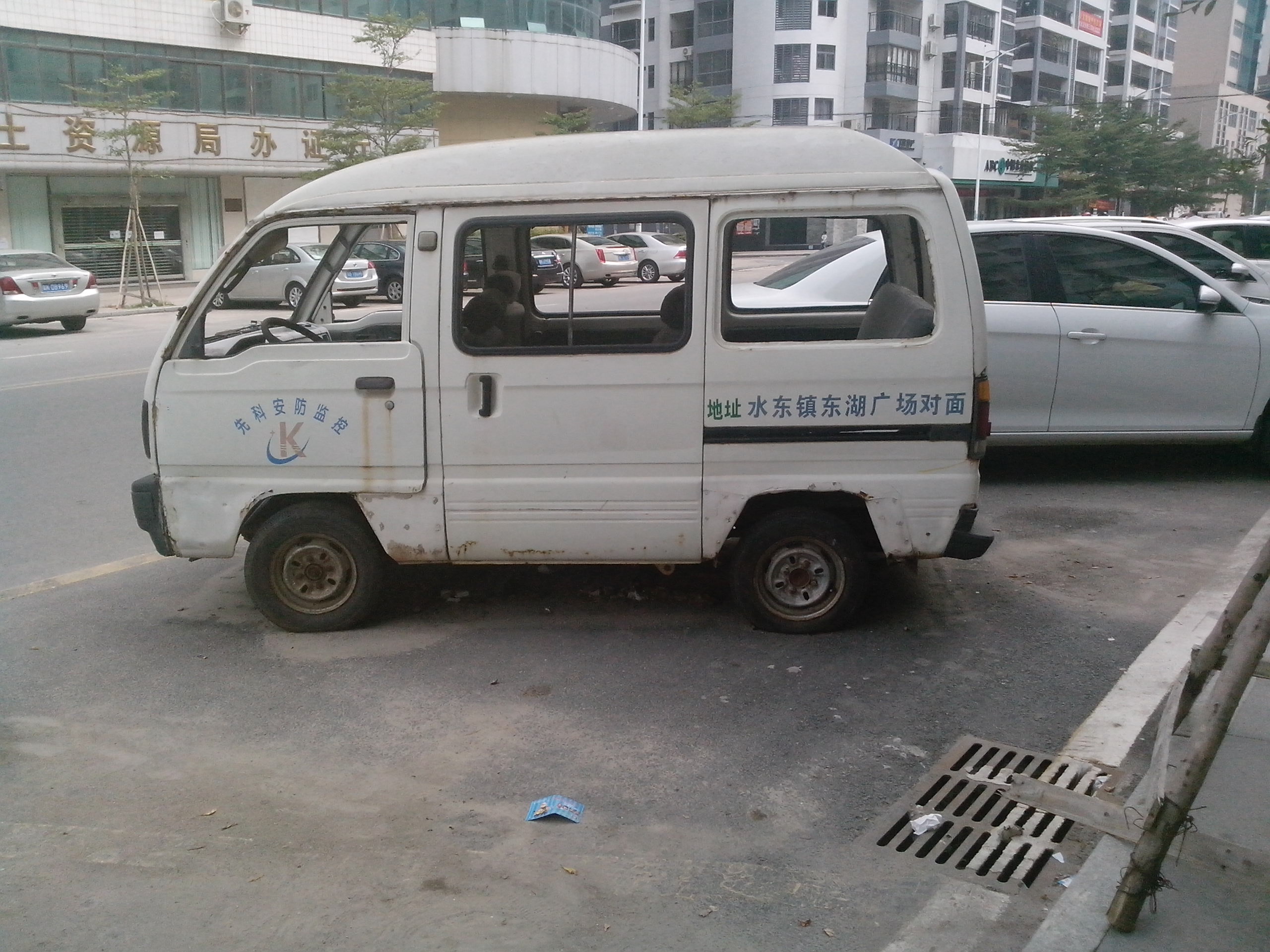 国土局门口也有一辆前挡风及侧面玻璃破碎的面包车长期停着。