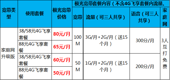 客户承诺使用相应38元及以上4G套餐12个月,可享受以优惠价格办理极光宽带套餐使用1年。只需一个宽带的价格和4G套餐,(流量,语音,即可3人共享,家庭网还能互打免费)。