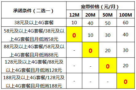 Ps:“-”代表不开展,“0”代表首年免费,以上宽带优惠期为12个月,第13个月起恢复标准收费(12M宽带50元/月,20M为60元/月,50M为90元/月,100M为100元/月),但可在到期当月办理续费享受新的优惠价格,具体优惠内容以到期当季的方案为准。