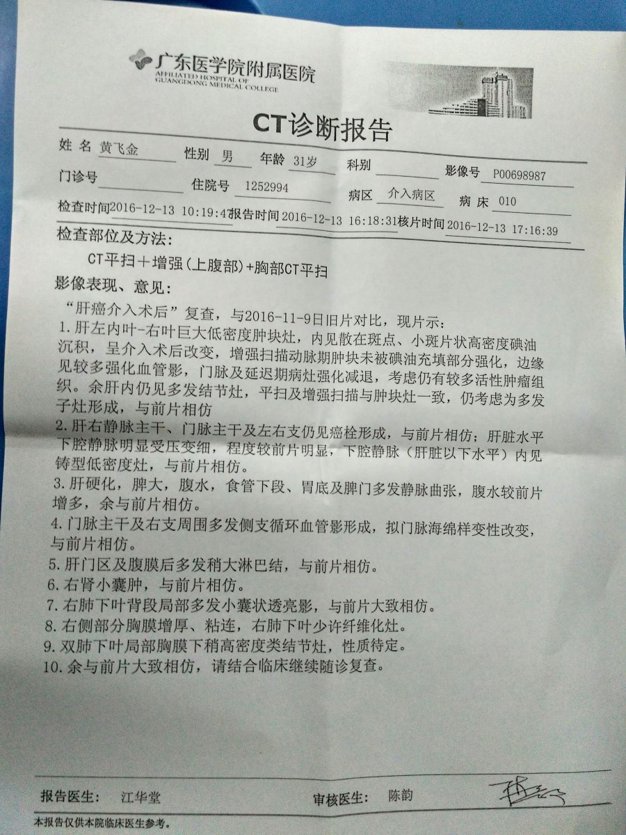 我叫车云凤,我老公叫黄飞金,家住茂名市茂港区小良镇北庄管区田头昌村,地道的农村小伙一名,我平时在茂名上班,老公在村跟村的人去工地做水电安装,我们有两个可爱的孩子,大儿子跟我住在外婆家,在羊角读书,小儿子在村里读学前班,平时上班各忙各的,相聚的时间也少,上个月我老公在茂名中医院检查出来肝癌第三期,又到湛江医学院附属医院做了介入手术,现在出现肝腹水, 门静脉血管堵塞,须要做门静脉分支手术,手术费用在15万左右,现在光住院费都1000~1500块钱一天,上次介入手术时,急急忙忙在轻松筹筹了4万块钱才够交手术费,他每天都在承受病魔带来的痛苦,然而无论承受多大的痛苦,他也没想过放弃,我们大家每晚做梦都想着奇迹的发生,每天每夜我老公都在坚持着对抗病魔,我们都想他能再撑多十年,哪怕是五年都好,现在医生跟我们说只要做了门静脉分支手术,他病情就会得到很大的改善,只是手术的费用要十几万,可我们家能借的借了,能卖的卖了,还是不够,现在在医院照顾他,我有工作也去上不了班,没有工作,也就没有了收入,希望各位善心之人可以伸出援手,救救我孩子的父亲吧,现在两个孩子天天都在问婆婆和奶奶,爸爸妈妈什么时侯才回家呢……请大家帮帮我吧!众人拾柴火焰高,能力不分大小,捐款不分多少,善举不分先后.贵在有份爱心,滴水汇成大江,碎石堆成海岛,哪怕就是一元钱,只要您献出爱心,我就多了一份生存的希望,只要人人献出一点爱,世界将变成美好的人间!感谢大家,好人一生平安!在轻松筹发布了信息,大家帮帮忙转发出去吧!微信13902546587。轻松筹连接http://m.qschou.com/project/index/73576225-9d04-4fc7-9eba-74c20c8a2fe9 IMG_20161217_215904_HDR.jpg IMG_20161110_152940_HDR.jpg