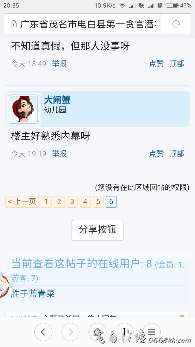 hchcc 说: 马甲兄这帖让电白多了一名精神病患者,一个月来惶惶不可终日导致精神失常,究竟是真病还是假病,当事人自己才清楚了。 点击展开... 谁知道那个精神病患者是谁呢?我只知道楼主再没出现了,我对他的处境堪忧。