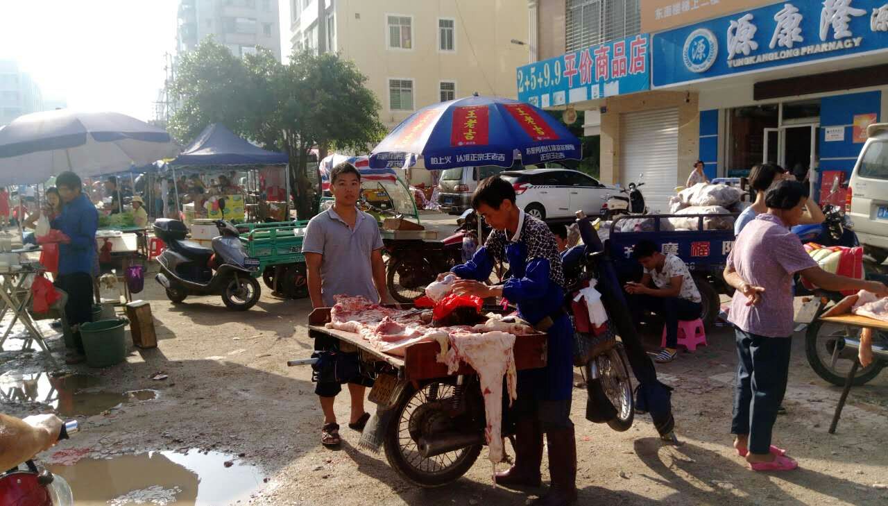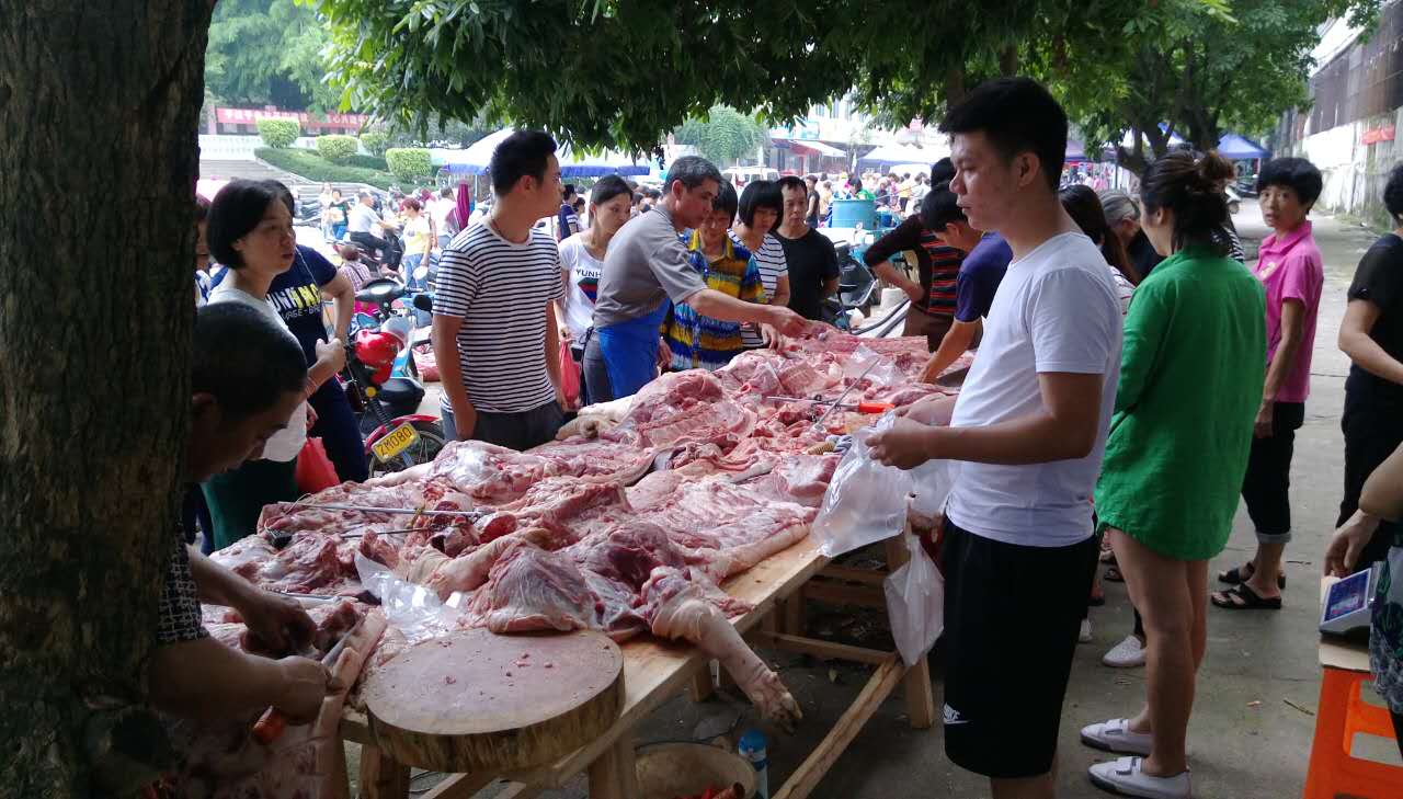 5月12日杨梅小学门口临时集市猪肉供应充足。(区畜牧兽医局摄)