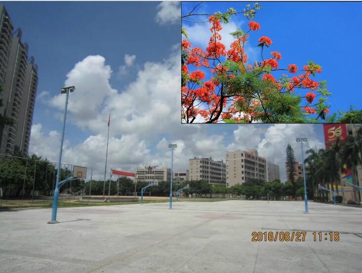 为水东中学球场。远方球场的北面有一棵夏季盛开红花的凤凰树