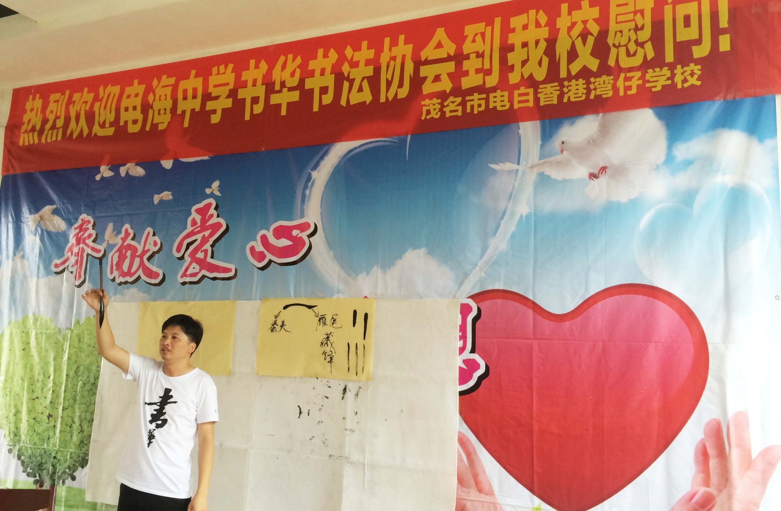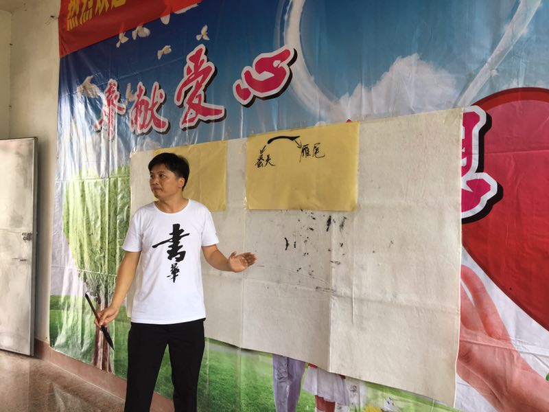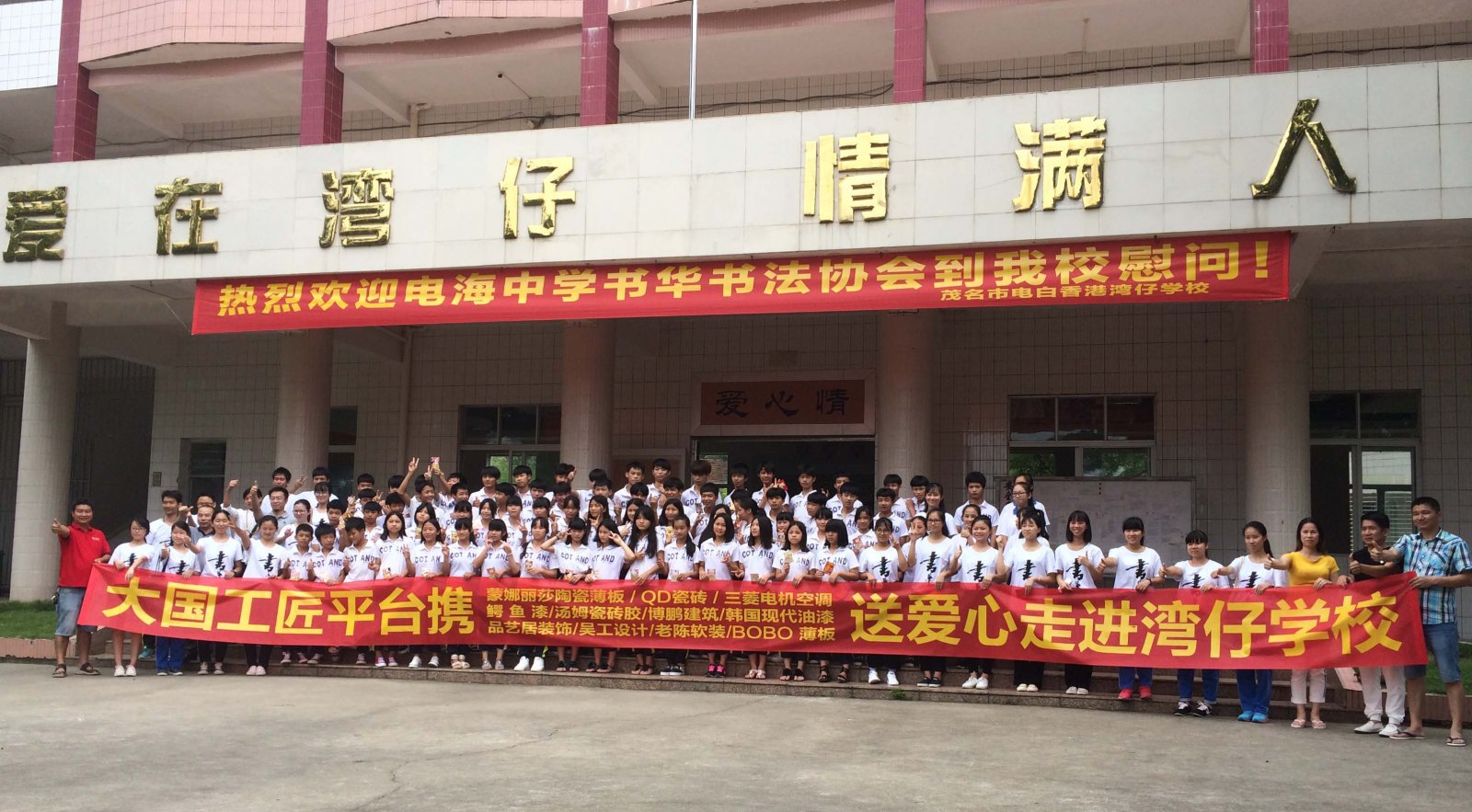 由电海中学“書華书法协会”携手大国工匠等爱心企业发起的献爱心活动——書華文化书法课堂于本本周周六早上走进电白区香港湾仔学校。书协的老师与学生带去师生们与社会各界捐赠的物品、慰问金及一批书籍等,并带去最宝贵最生动的一节第二课堂——书法课。课堂上,使用主讲老师授课,助教老师带动的教学模式,16位助教学生在四位主讲老师的带领下,第一次完成了这么大型的书法基础课程。全体湾仔小学学生共68人,他们第一次接触书法课,也是第一次有这么多老师同时授课,效果相当明显。