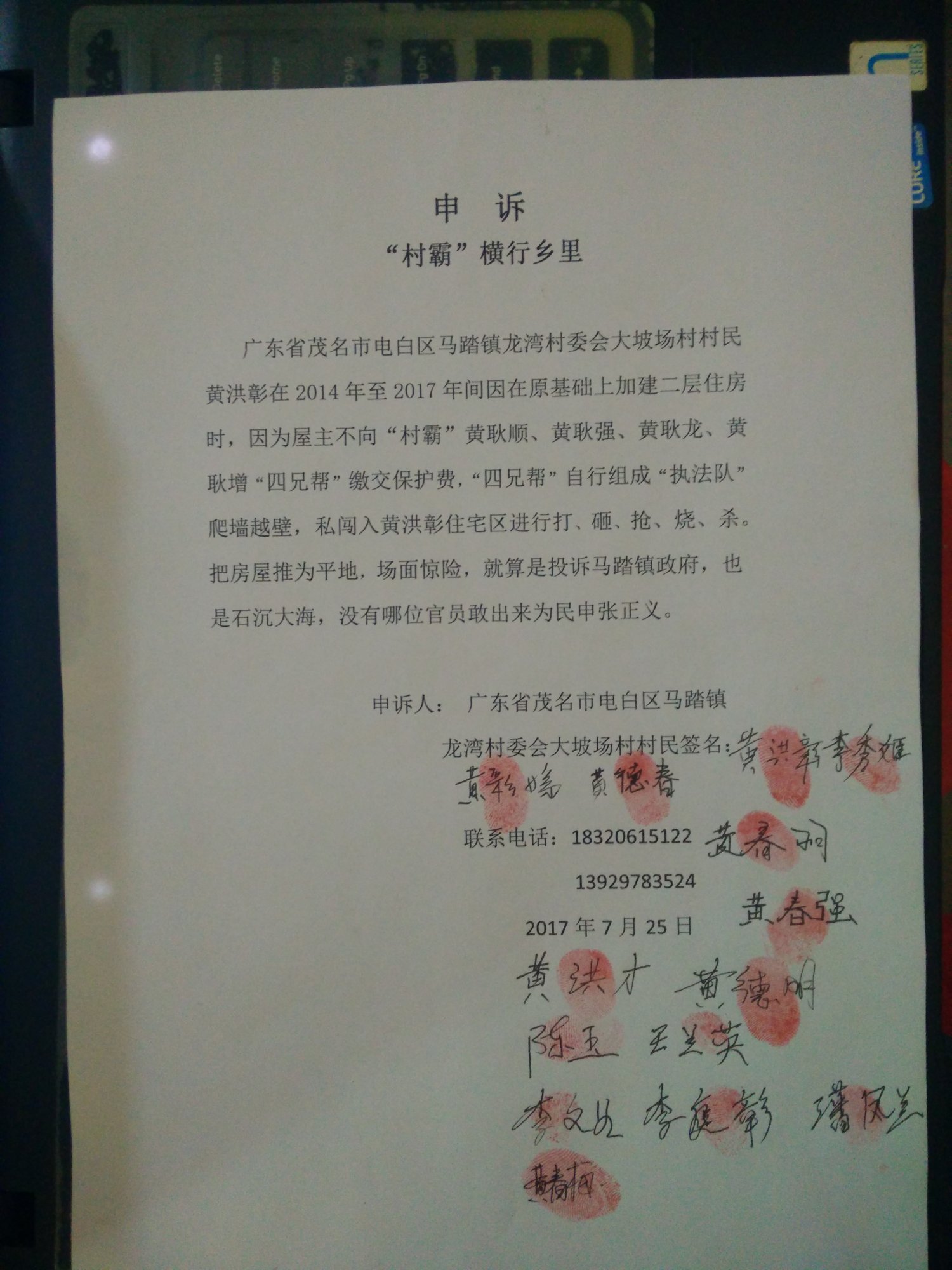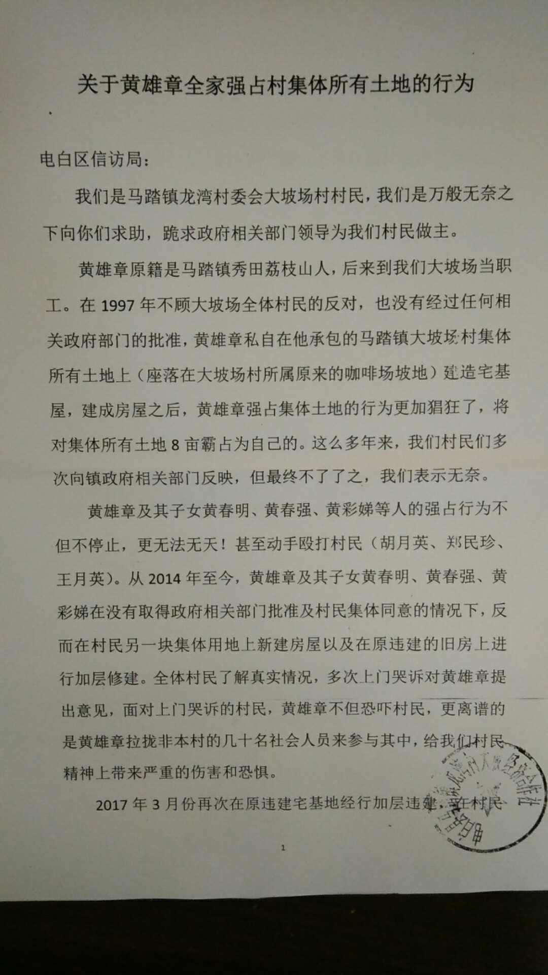 广东省茂名市电白区马踏镇龙湾村委会大坡场村村民黄洪彰在2014年至2017年间在原基础上加建二层住房时,因为屋主不向“村霸”黄耿顺、黄耿强、黄耿龙、黄耿增“四兄帮”缴交保护费,“四兄帮”自行组成“执法队”爬墙越壁,私闯入黄洪彰住宅区进行打、砸、抢、烧、杀。把房屋推为平地,场面惊险,就算是投诉马踏镇政府,也是石沉大海,没有哪位官员敢出来为民申张正义 IMG20170730161958.jpg