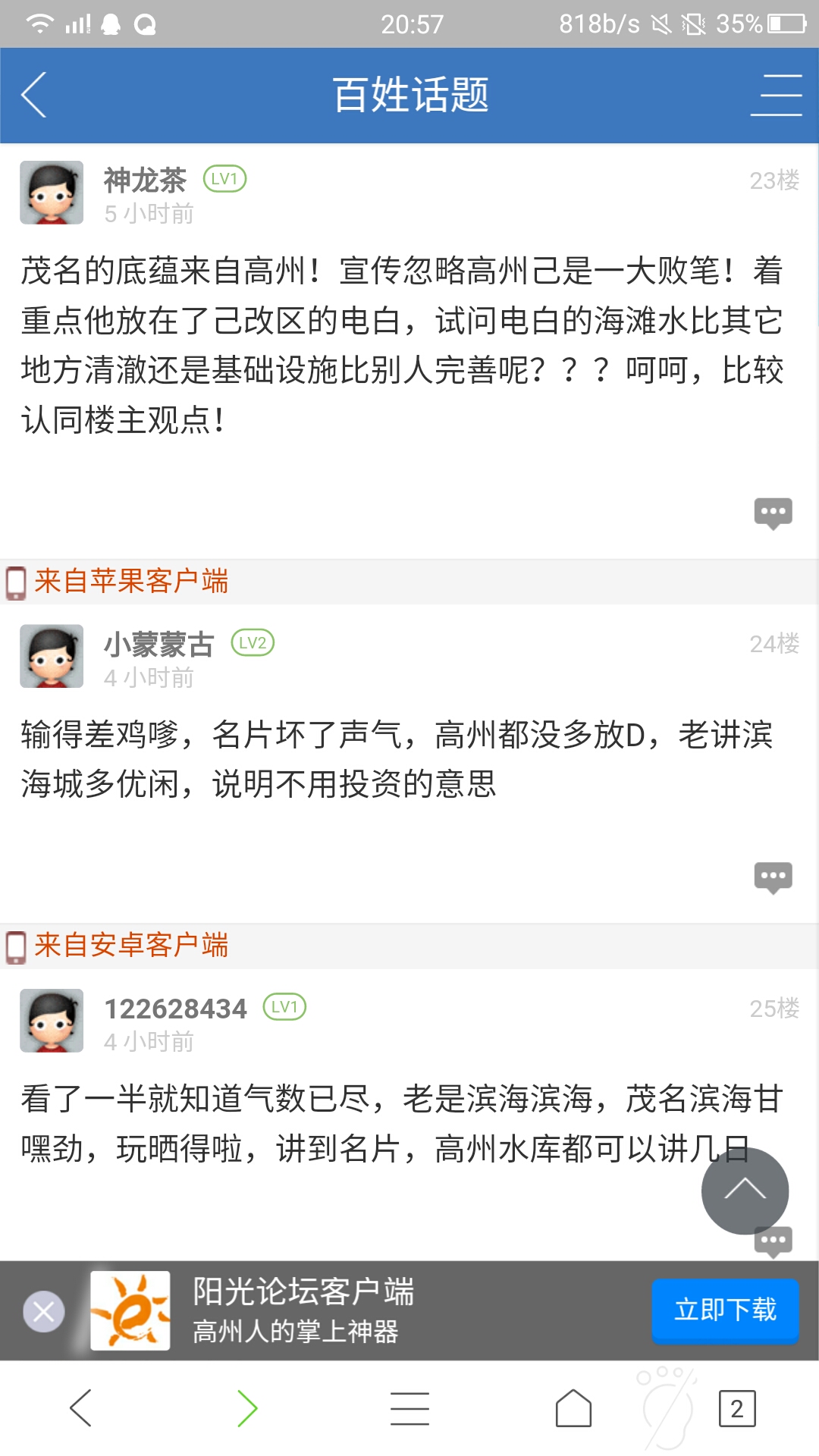 茂南论坛现在到处发贴喷因为从头到尾都展示大海主题然后让它们输掉比赛了!它们怎么不说没有了海它们有什么可以展示给别人看,要名山没有要大江大河大湖没有,要高楼大厦没有,要名胜古迹没有,给别人展示茂南狗和茂南土白吗?