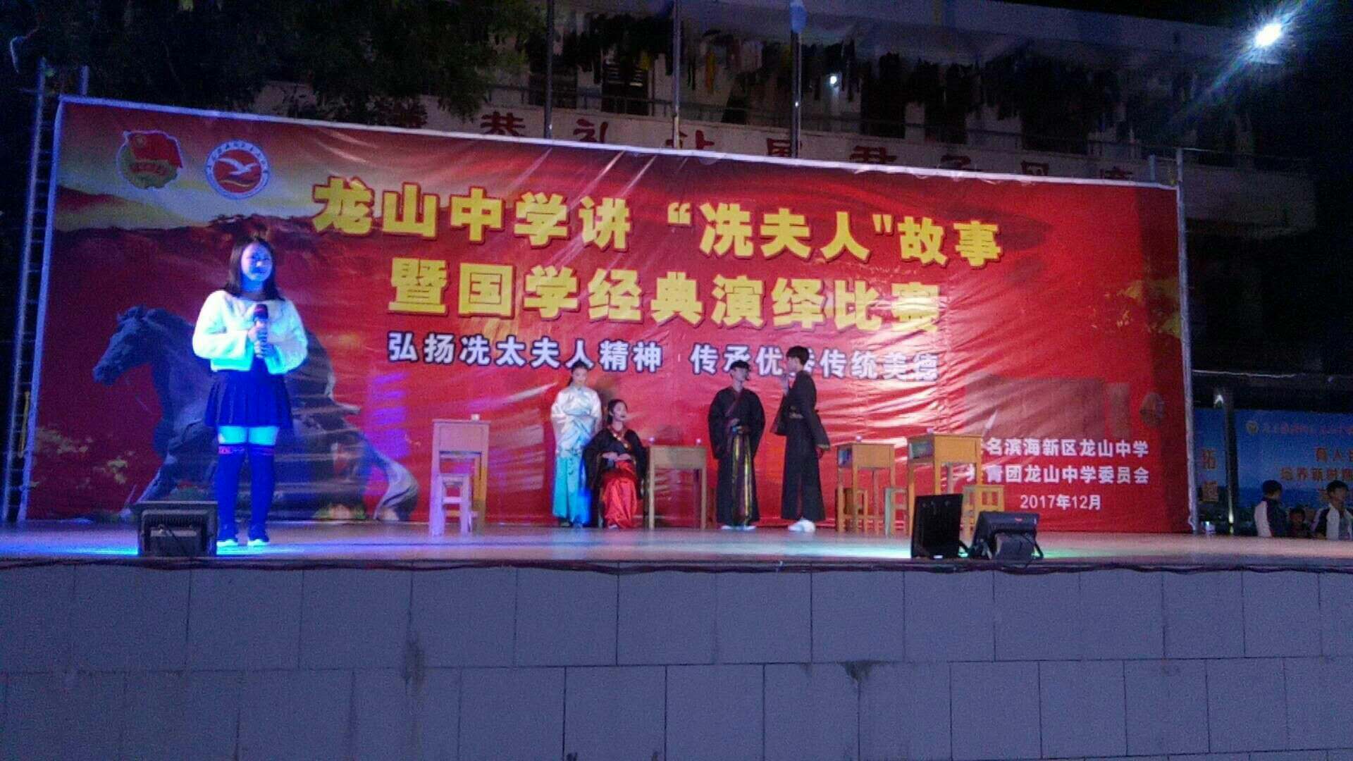 在茂名滨海新区举行讲“冼夫人”故事活动的背景下,龙山中学在上周四(21日)晚举行讲冼夫人故事的舞台剧晚会。这是该校第一次举行舞台剧晚会,颠覆了非歌则舞的学校晚会历史。