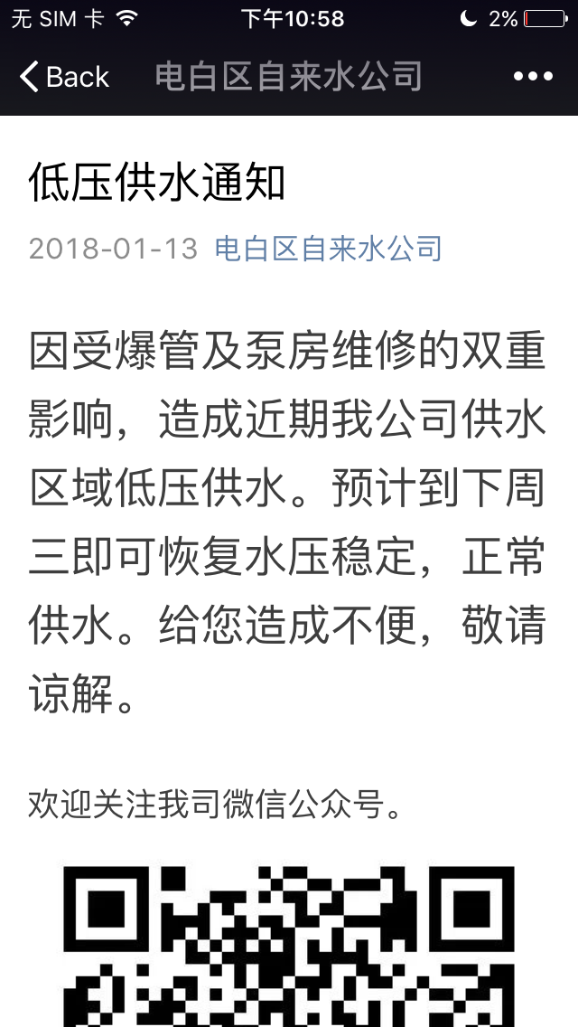 水东老城区,管道等设施或许跟不上现在用水需求,停水可以理解,但自来水公司能否提前通过多种渠道告知用户,做好解释工作?(个人觉得电力局在这点就做的比较好,基本短信到单位或个人),除了临时爆水管外,很多低压供水或者检修断水都可以提前告知,让我们做好储水工作!