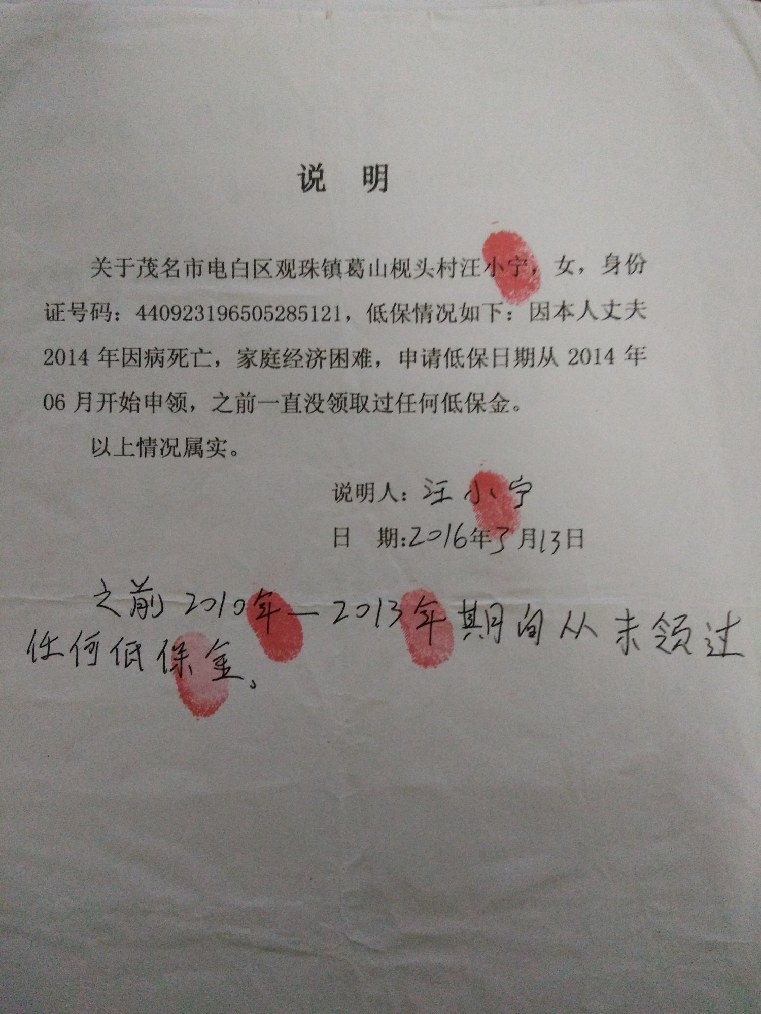 汪某之前生活非常好,其在正街开发廊老公开东风车,在观珠圩有三层楼房。后来老公患上癌症病亡后2014年申请领过一年低保。