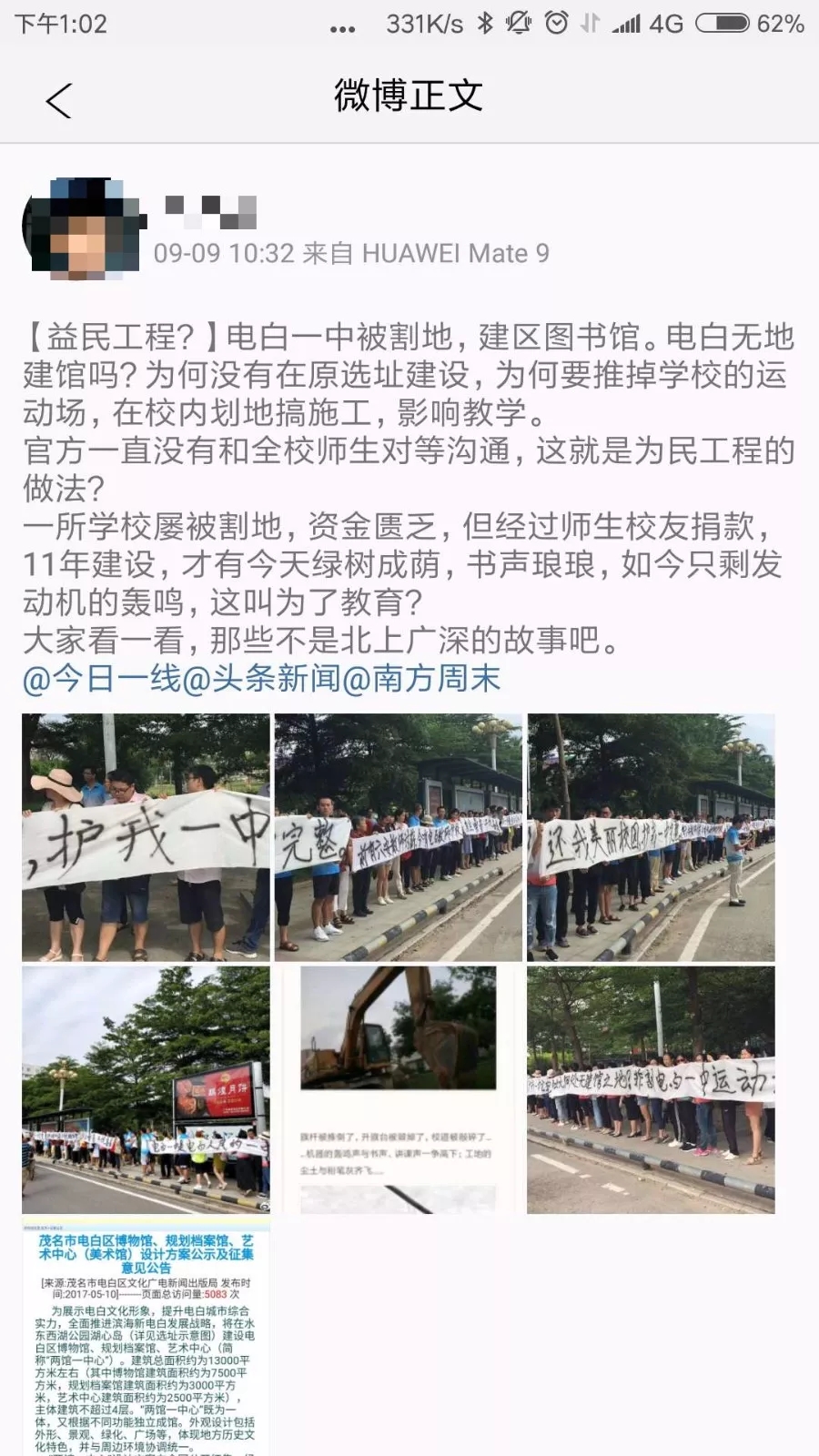 我不明白,电白之大,何处不能建三馆,非割我一中运动场?我不知道,历经三次被割地的一中下一次是否会被强制搬迁?我不知道,电白一中的命运会在何方,电白教育的出路又何在何方