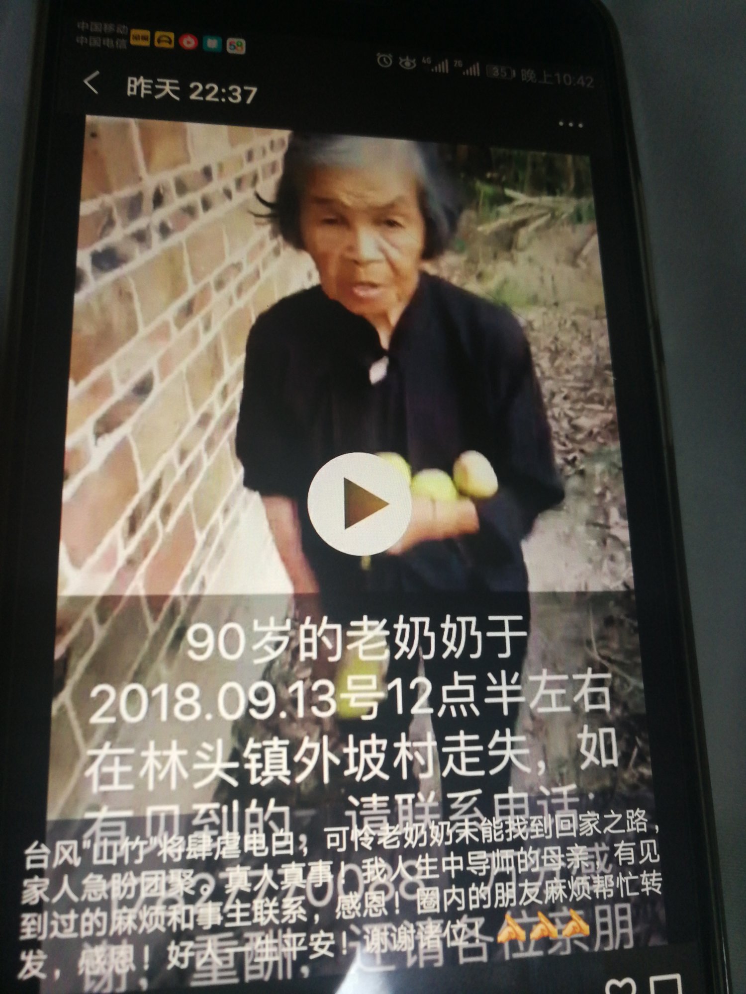 寻人启事 林头镇梹榔村委外坡村民黄如英,女,九十岁,有老人痴呆症,于九月十三日晚六点半从家中走失,至今未归,家人心急如焚,若有人找到者请致电蔡先生,电话18027775673.酬金伍万元! 附上老人近期视频。