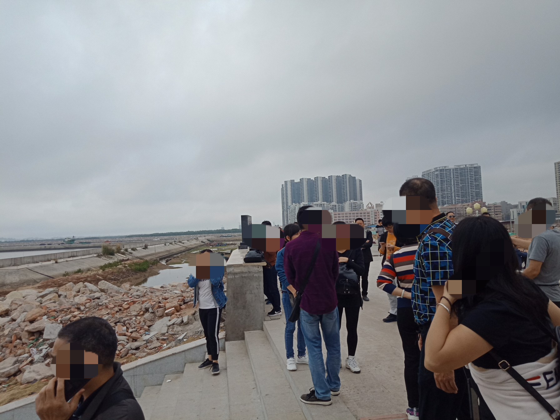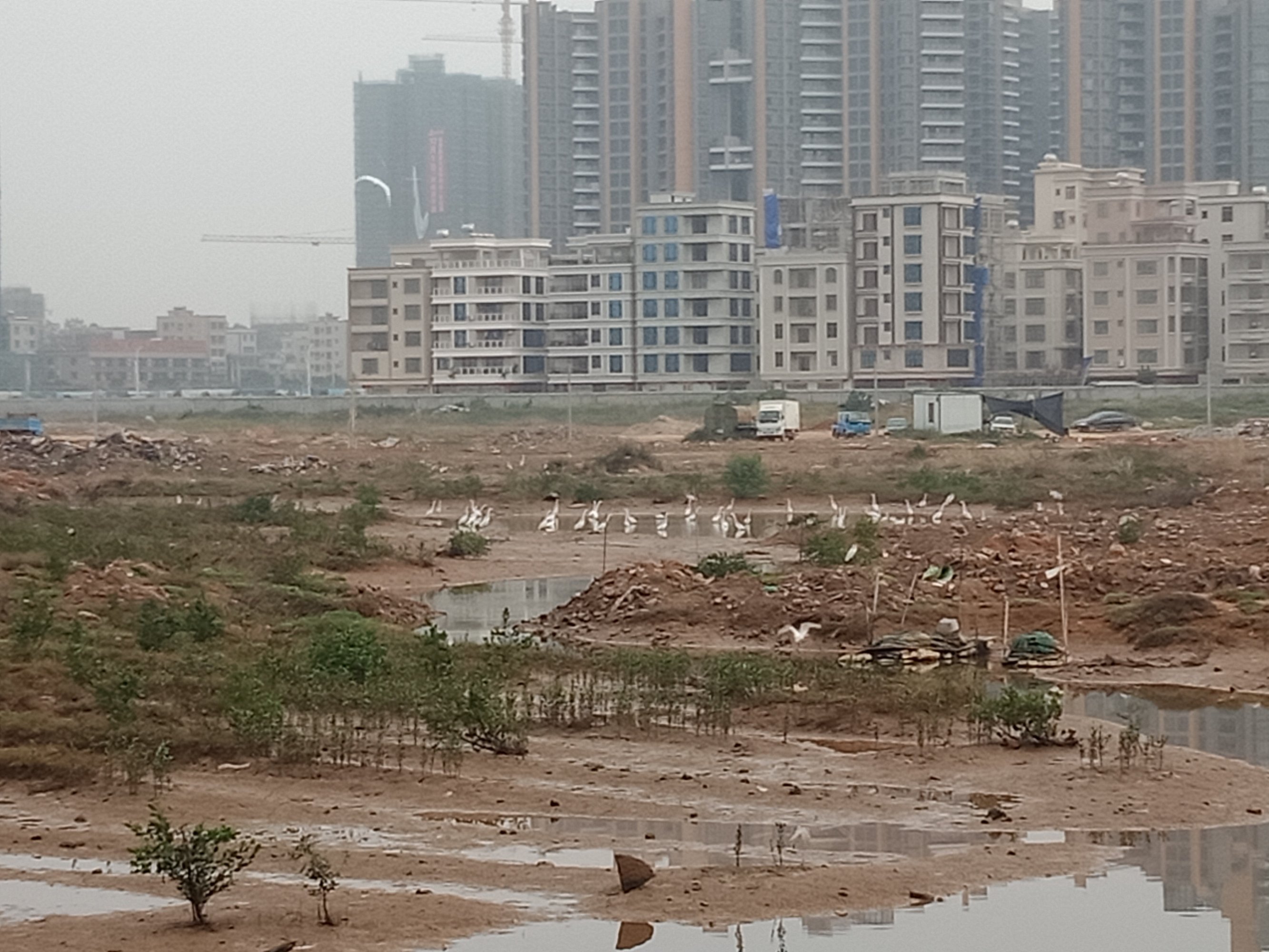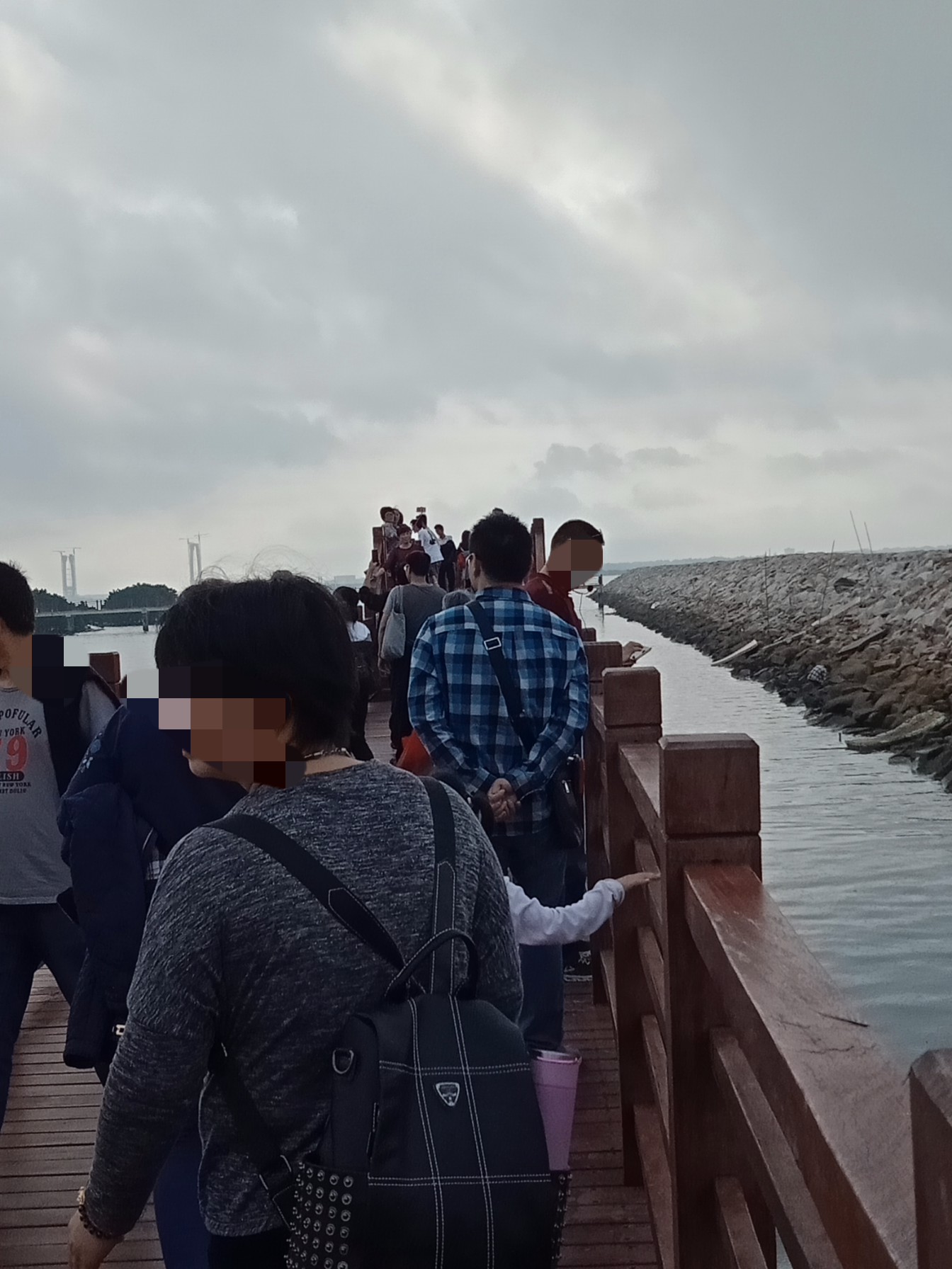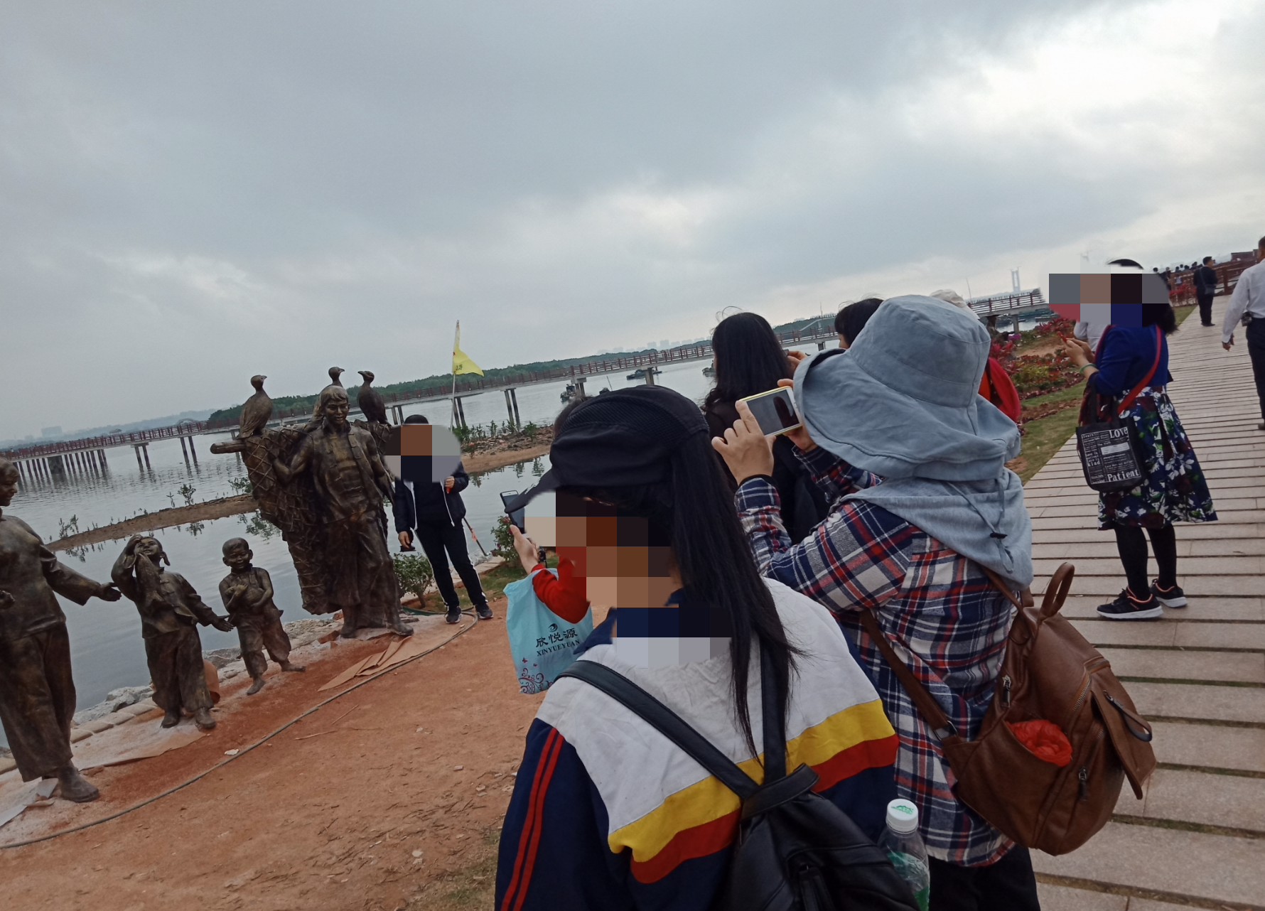 看图为何他她们在两边看什么,因为两边海面上有好多鱼儿在水面寻吃嬉戏等,一大片挺吸引人,而那边水面上又有自制鱼排船在停靠清洁等,而远处有零星白鹭在水面飞翔寻食~发现有好多白鹭者飞去对面工地的浅水面上?