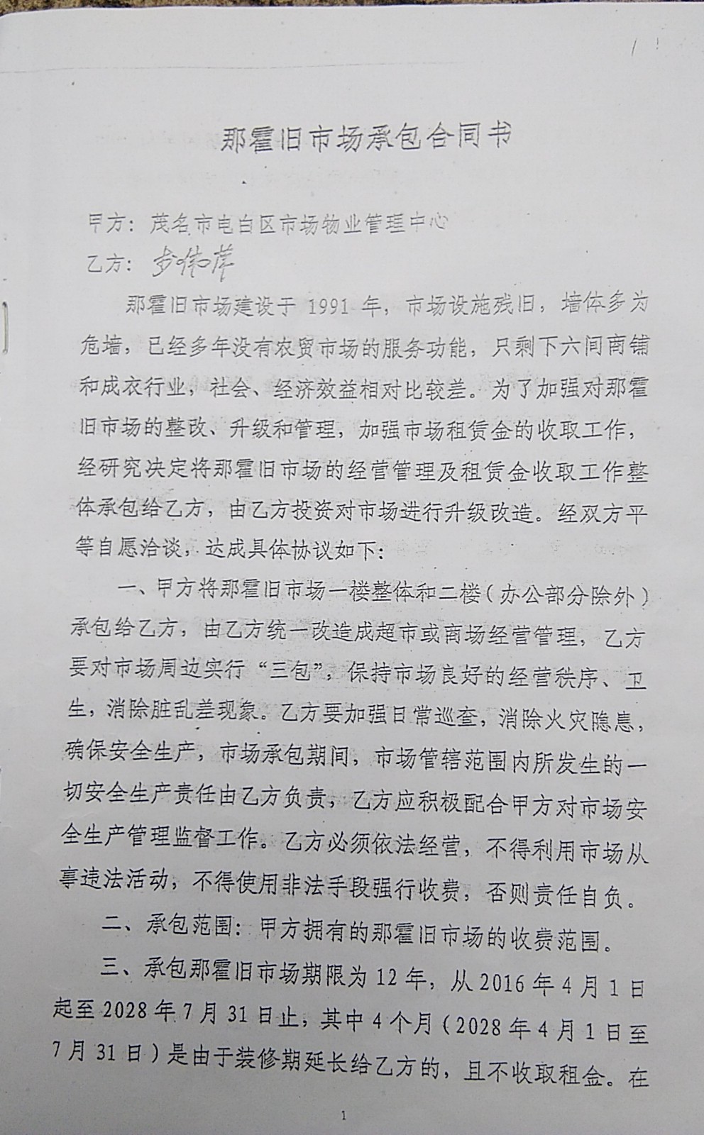 我们是电白区那霍镇农贸市场的原租户,现集体请求茂名市纪委查处巨贪一一电白区市场物业管理中心主任李文河。理由如下: