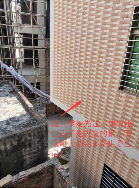 国家号召天下“实行一户一宅,建新必须拆旧”,对方的大楼是先建的,而违建房子却是后来建的,按理说,应先拆掉旧屋(即下图大楼),才能建新房子!