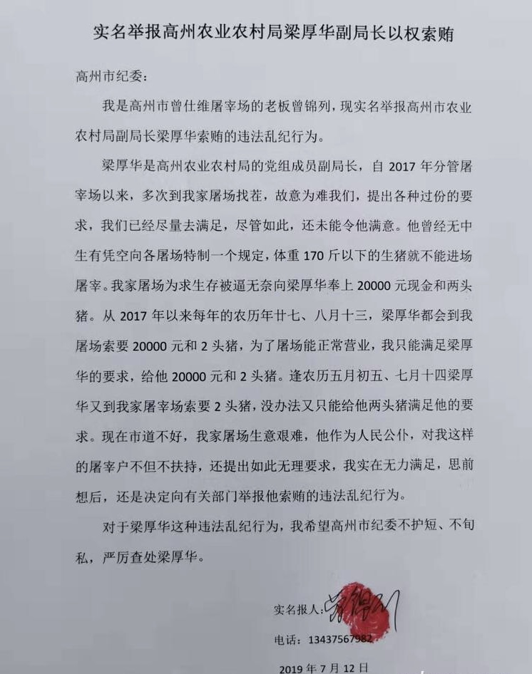 在茂名在线论坛茂名市监察委版块惊悉高州市农业农村局某副局长涉嫌违纪,希望能得到相关纪检监察部门的回复。本人将持续每天关注茂名廉政网一段时间。