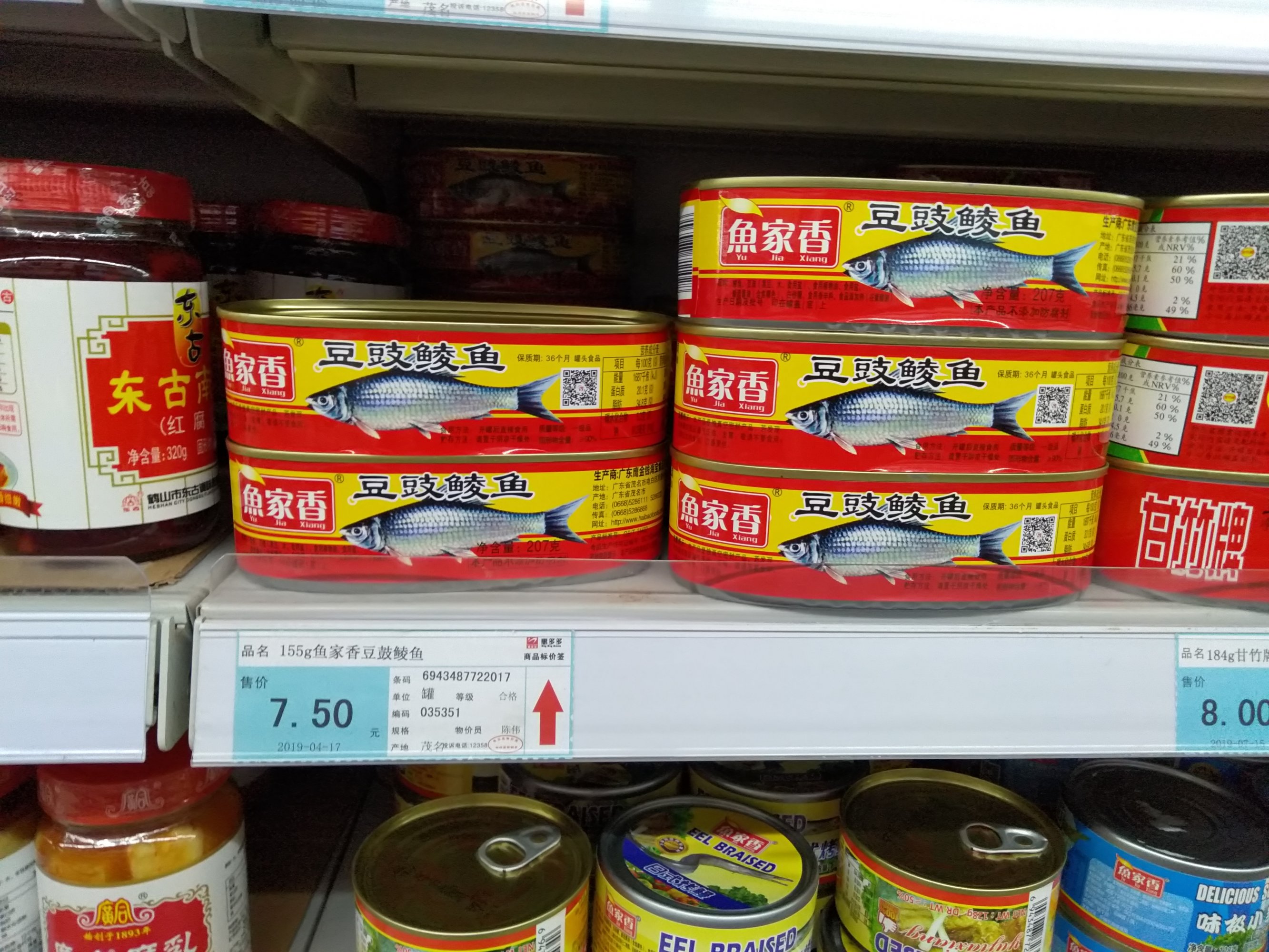 坏多多。逛坏多多超市看到某厂牌罐头鱼是电白产的,就想着体验下电白企业的产品,为支持下本地货就买了盒,然后又买了个甘竹牌的回去对比味道。买单时发现价格不对,为了证实我是不是老眼昏花于是我又回到货架看了下,结果货架放的克数货不对板,把价格高的放放到价格低的去了,这样感觉很不好,稍不留神是不能发现的,这种情况去服务台估计也是说员工摆错了之类的话,最多叫退钱什么,算了,这种情况发生太多次了。这盒本地豆豉鲮鱼口感偏硬,跟甘竹口感相比还是很大区别,希望本地企业再接再厉做得更好。浏览附件332299 浏览附件332296 浏览附件332297 浏览附件332298