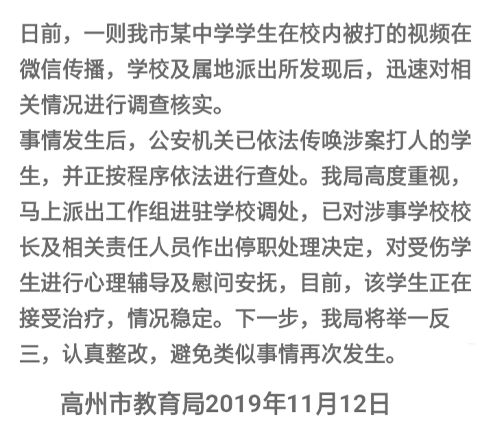校园欺凌现象总是以连续剧的播放方式来刺激家长以及网友们的神经,十二年前电白某中的“二死四伤”曾经引起全国轰动,近日教育名城高州的校内群殴亦令舆论哗然!